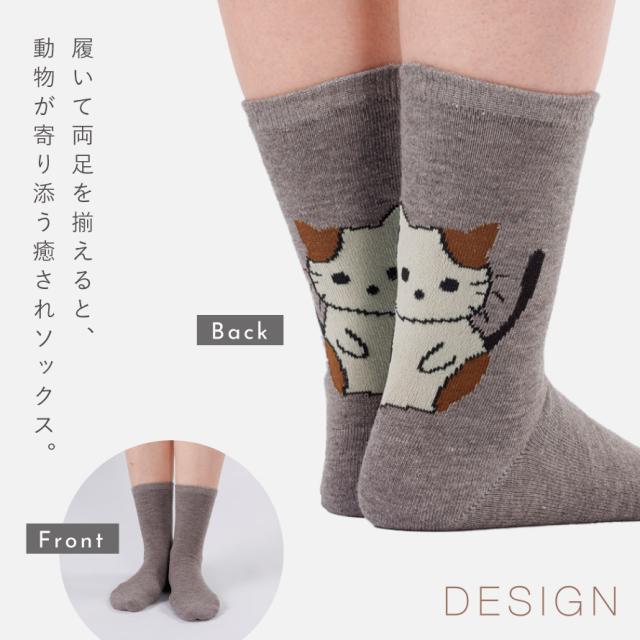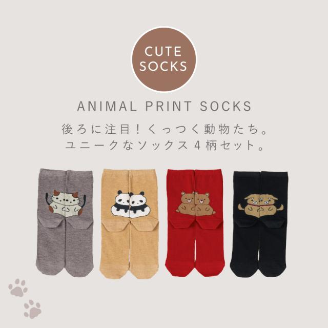 後ろの動物柄が可愛らしく寄り添う、ユニークソックス4柄セット。履いて両足を揃えると、動物が寄り添うキュートなバックイラスト。癒されるソックスセットです。