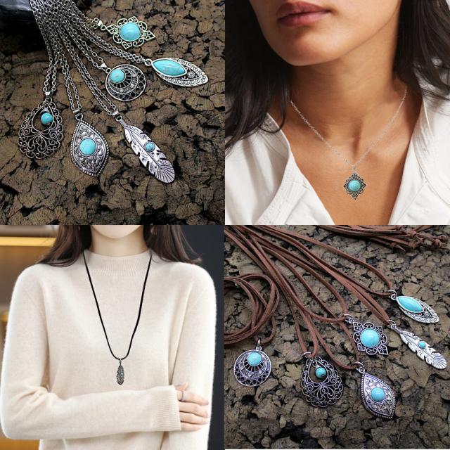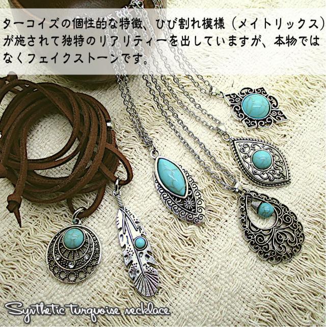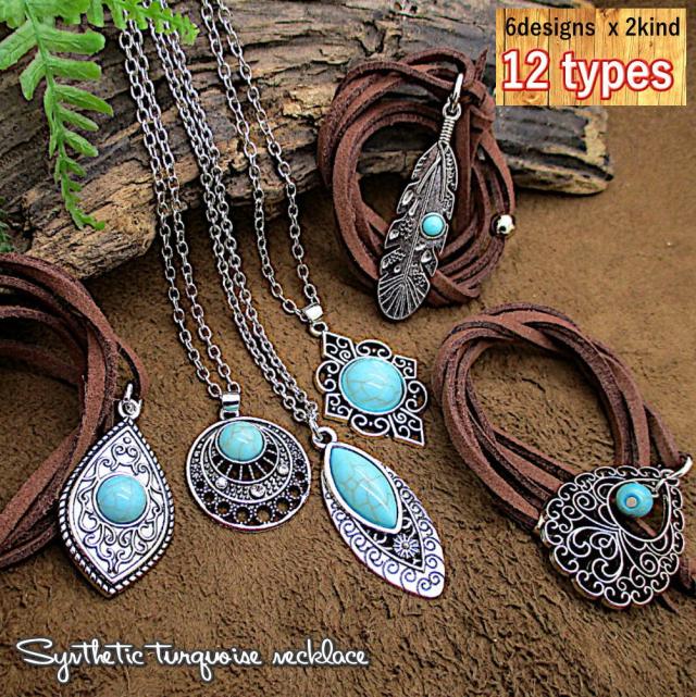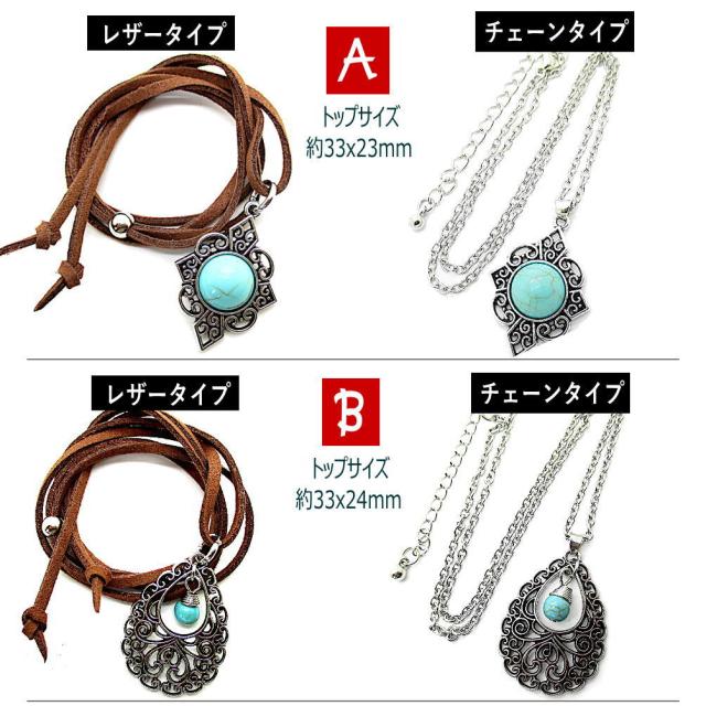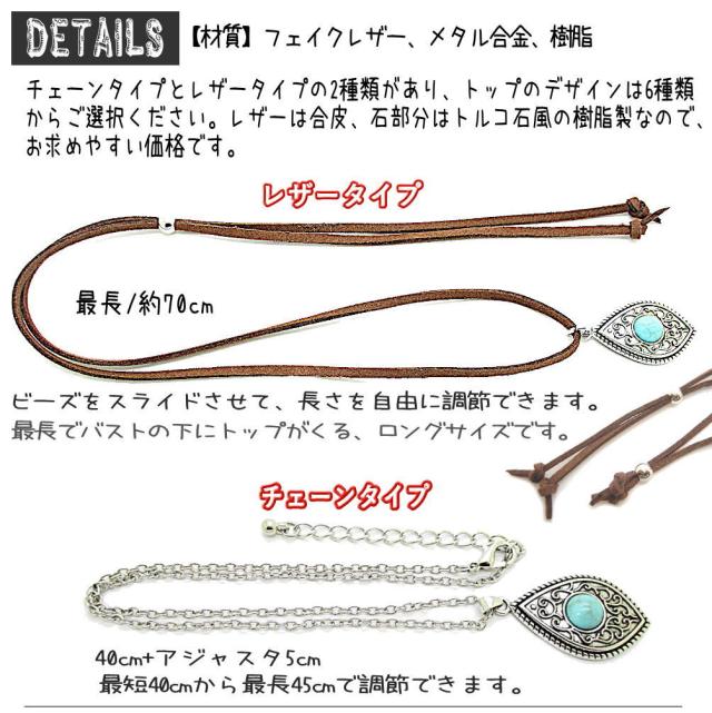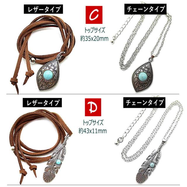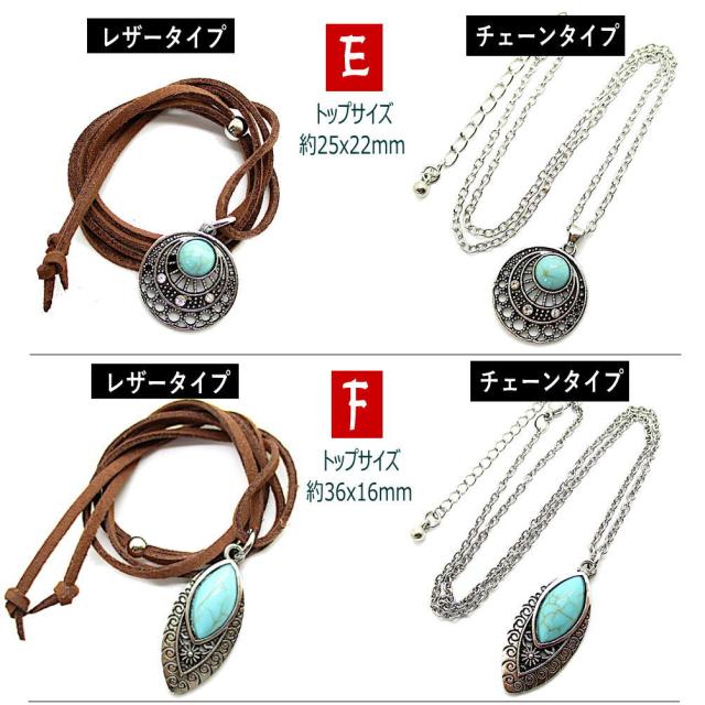 革ひも チェーン レディース ネックレス ペンダント 調節可 ロング フリーサイズ ターコイズ風 トルコ石風 インディアン ジュエリー風 チョーカー アクセサリー プレゼント 4-7850