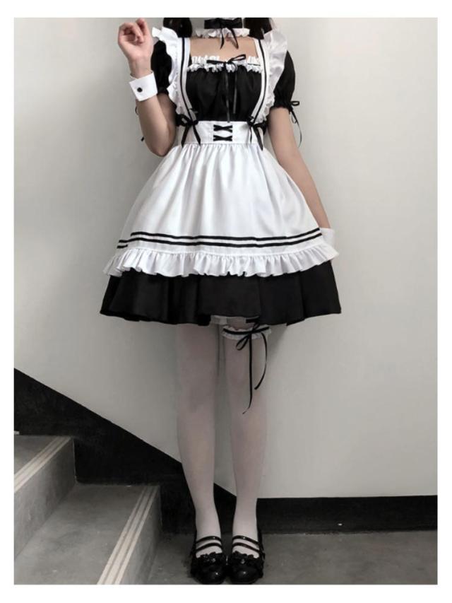 メイド服 コスプレ 衣装 8点セット ロリータ かわいい 女装 フリル コスチューム コスプレ衣装 ロリータワンピース アニメ エプロン 仮装パーティー 文化祭 イベント ハロウィン エプロン フリフリ 髪飾り付き 送料無料