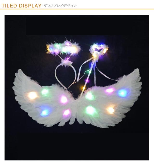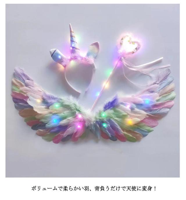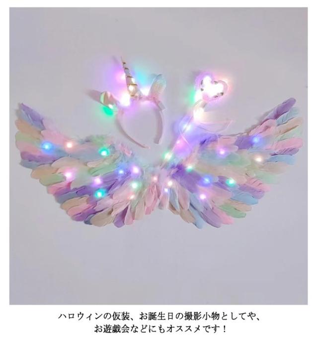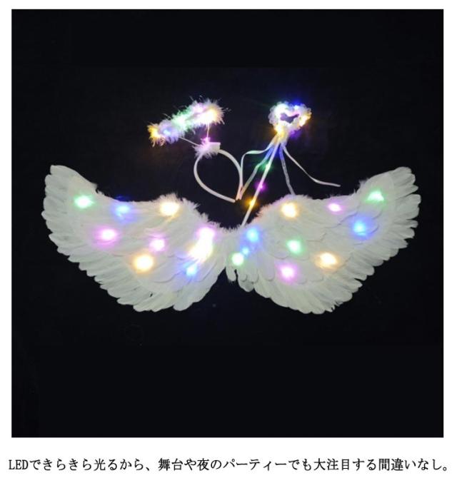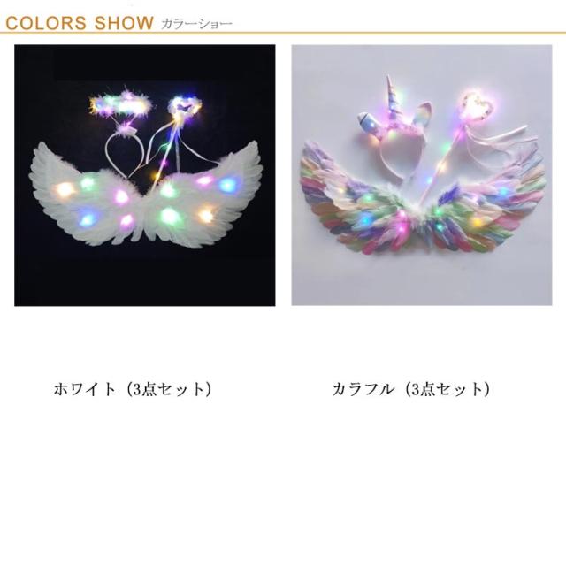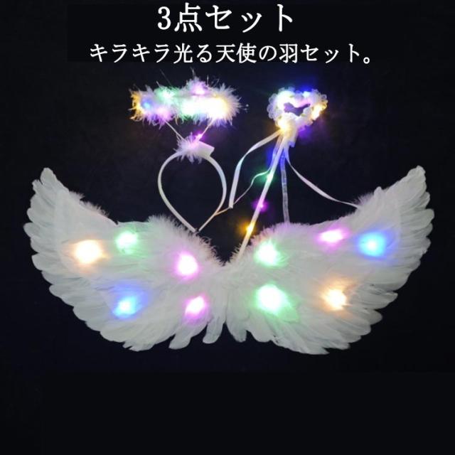 キラキラ光る天使の羽 3点セット ハロウィン コスプレ用 羽根 天使の羽 LEDライト付き 翼 フェザー ウィング イベント パーティー ハロウィン 妖精 コスプレ コスチューム 仮装 変装 変身 演出 大人 子供 男女兼用 ホワイト カラフル カラー