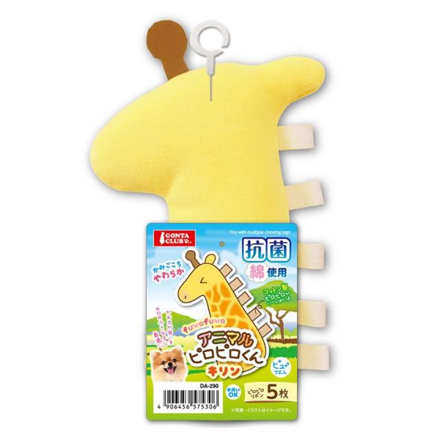 中綿に抗菌綿、リボンにコットンテープを使用し、動物(キリン)をモチーフにしたピロピロくん。