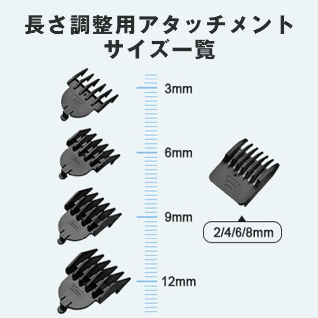 T型バリカンは3mm/6mm/9mm/12mmまで刈り高さを選べるので子供から大人まで好みの長さに調整可能。シェーバーは毎分9,000回転の高速モーターでスピーディーに髭剃りができ、バリカン・鼻毛カッターは丸い刃を採用しているので、肌を守り優しくカットできます。