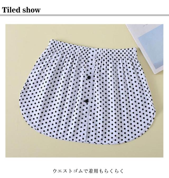 | シンプルなシャツタイプのレディース用付け裾 やわらかく肌触りの良い生地を使用。 シンプルなデザインで様々なトップスと相性抜群◎ ウエストゴムで着用もらくらく | |