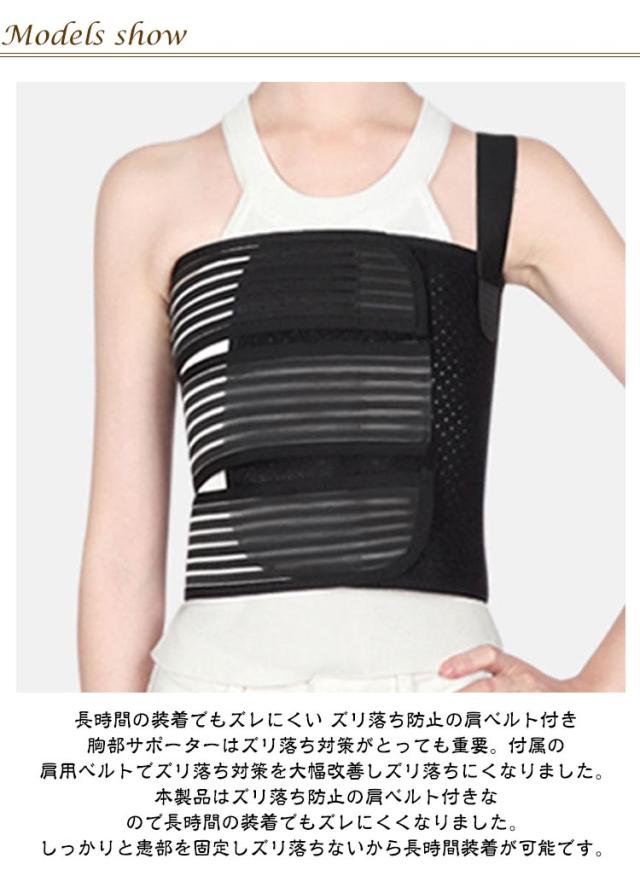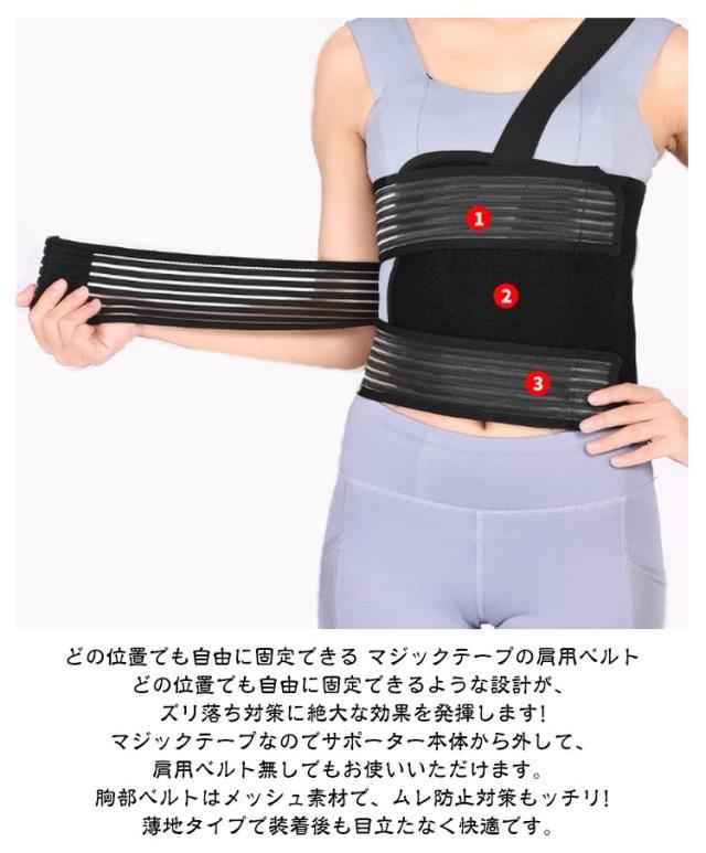 | ズレ落ちない! 蒸れにくい! 胸部・肋骨サポーター 男女兼用 S/M/L <お勧めポイント> ●01.長時間の装着でもズレにくい ズリ落ち防止の肩ベルト付き 胸部サポーターはズリ落ち対策がとっても重要。付属の肩用ベルトでズリ落ち対策を大幅改善しズリ落ちにくなりました。 本製品はズリ落ち防止の肩ベルト付きなので長時間の装着でもズレにくくなりました。 しっかりと患部を固定しズリ落ちないから長時間装着が可能です。 ●02.胸まわりにジャストフィット 胸部を2本のマジックテープで固定 胸部は上下に分割された3本のマジックテープがあります。胸の上下で異なる締めつけ感に調節ができるため、ジャストフィットで使用でき、しっかりと固定されます。 ●03.どの位置でも自由に固定できる マジックテープの肩用ベルト どの位置でも自由に固定できるような設計が、ズリ落ち対策に絶大な効果を発揮します! マジックテープなのでサポーター本体から外して、肩用ベルト無しでもお使いいただけます。 胸部ベルトはメッシュ素材で、ムレ防止対策もッチリ!薄地タイプで装着後も目立たなく快適です。 ●04.装着がとってもラクにできる 抜群の伸縮性 伸縮性があるから、自分の身体に合わせて装着がしやすいです。 【着用方法】 1.胸部固定用の3本のマジックテープを外します。肩用ベルトは片方を最初に外しておいてください。 2.背中にサポーター本体をあてます。マジックテープ部分は右手側でも左手側でもどちらでも大丈夫です。装着しやすい側を選んでください。 3.マジックテープを1本ずつサポーター本体に仮止めします。仮止めをしたら、今度はしっかりと調節をしながらとめてください。 4.次に肩用のベルトを装着します。肩用のベルトを装着する場合は装着したサポーターを肩用ベルトが装着できるように少し身体の周囲を動かして調整してください。 5.肩用ベルトをマジックテープで調節しながら装着します。(※肩用ベルトはマジックテープで本体から取り外せます。) | |
