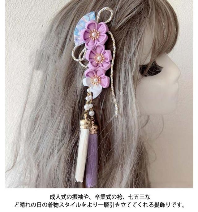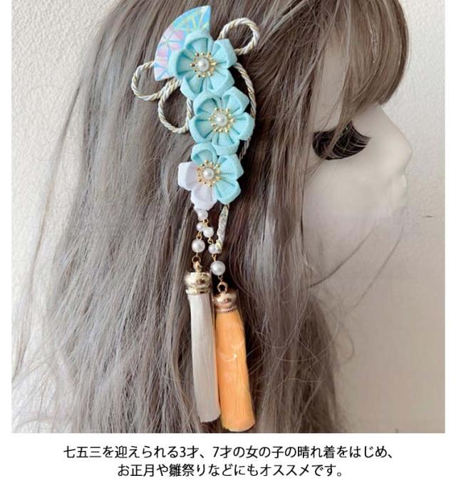 | 七五三を華やかに彩る髪飾り。 着物のヘアスタイルを彩る、房飾りをあしらい、縮緬の梅の花やタッセルが施されています。 七五三を迎えられる3才、7才の女の子の晴れ着をはじめ、お正月や雛祭りなどにもオススメです。 軽やかに揺れるタッセル付き、鮮やかな色使いなので、様々なお着物と相性が良い花飾りです。 成人式の振袖や、卒業式の袴、七五三など晴れの日の着物スタイルをより一層引き立ててくれる髪飾りです。 | |