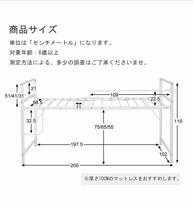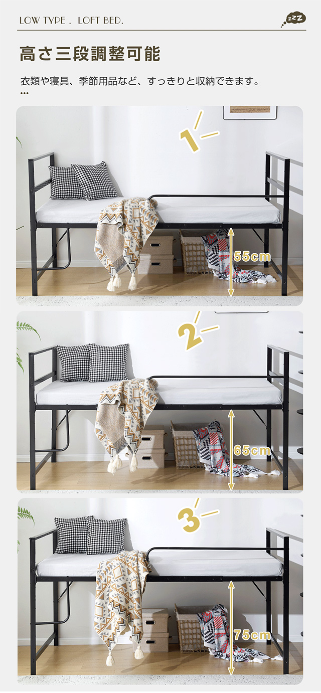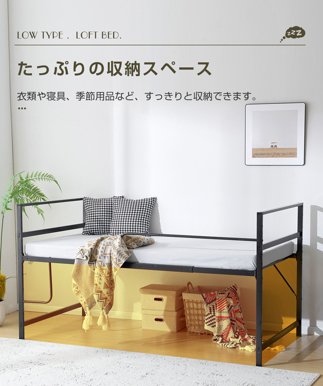 【110cm高さのロータイプ 】ちょうどいい高さで天井からの圧迫感がなく、毎日の昇り降りや、布団の上げ下ろしを楽にすることができます。