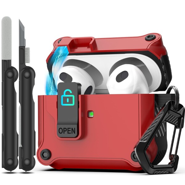RFUNGUANGO Airpods 第 3 世代ケース、安全なロック クリップ付き、フルボディ耐衝撃ハードシェル保護、AirPods 3 ケース Apple AirPod 第 3 世代 2021 と互換性あり (前面 LED 表示) - レッド