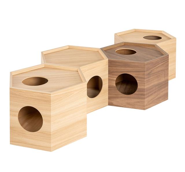 1台で使えばペットハウスに。複数台重ねてキャットタワーにしたり、横に並べてトンネルテーブルにしたりすることができます。天板は穴あきタイプが2枚、穴無しタイプが1枚の計3枚が付属。お好みで付け替えることが可能です。