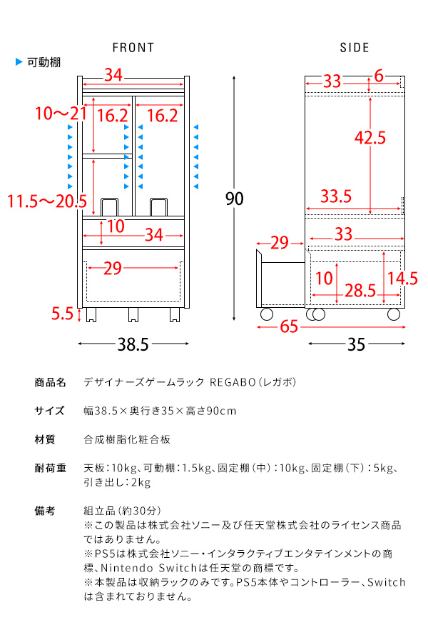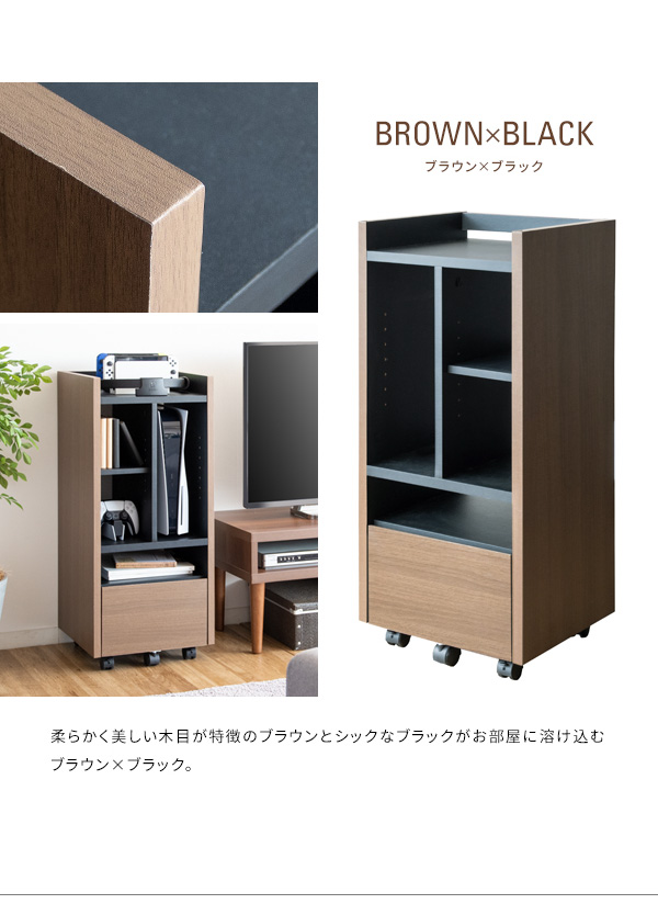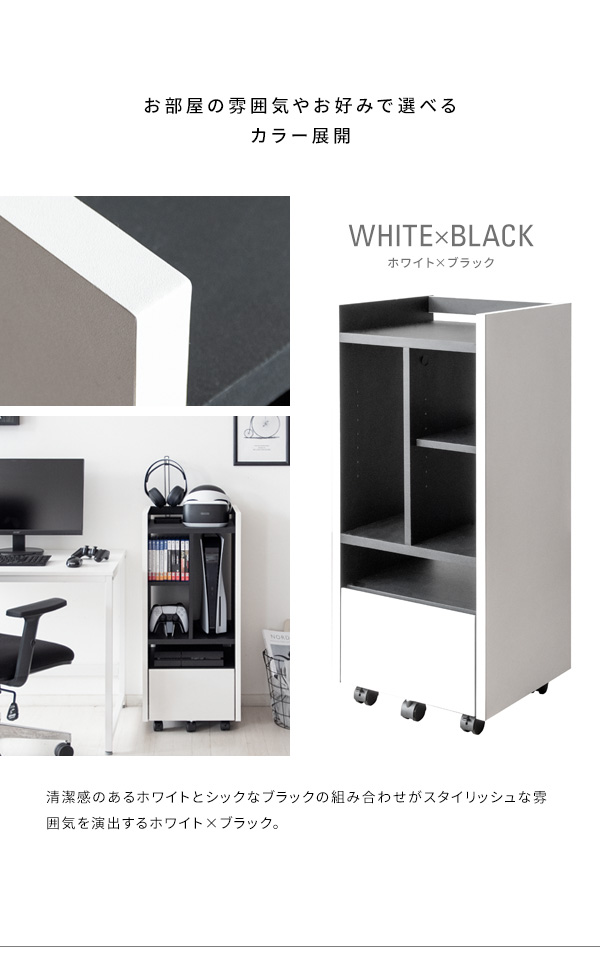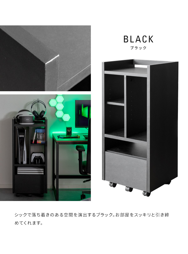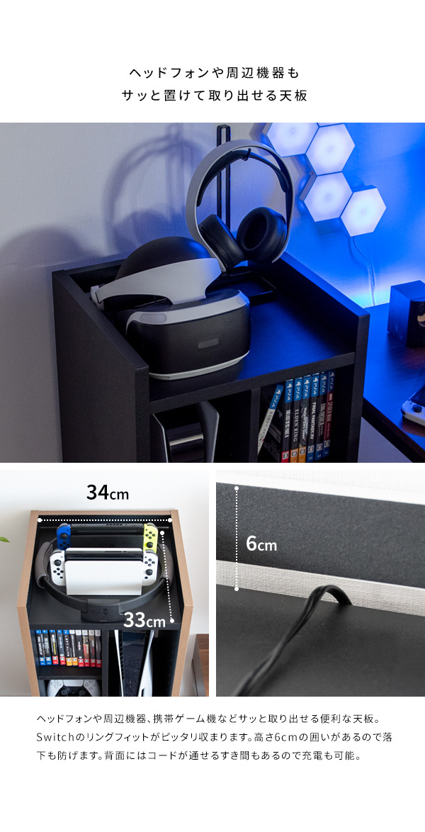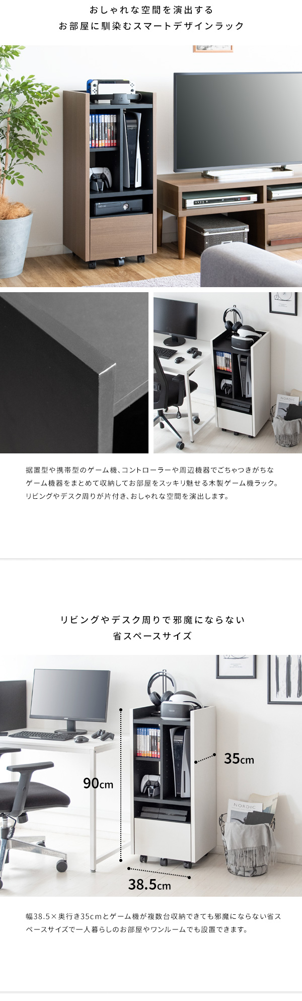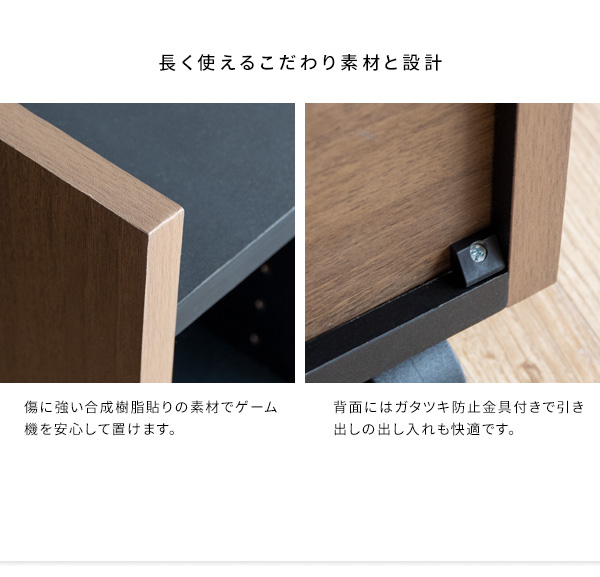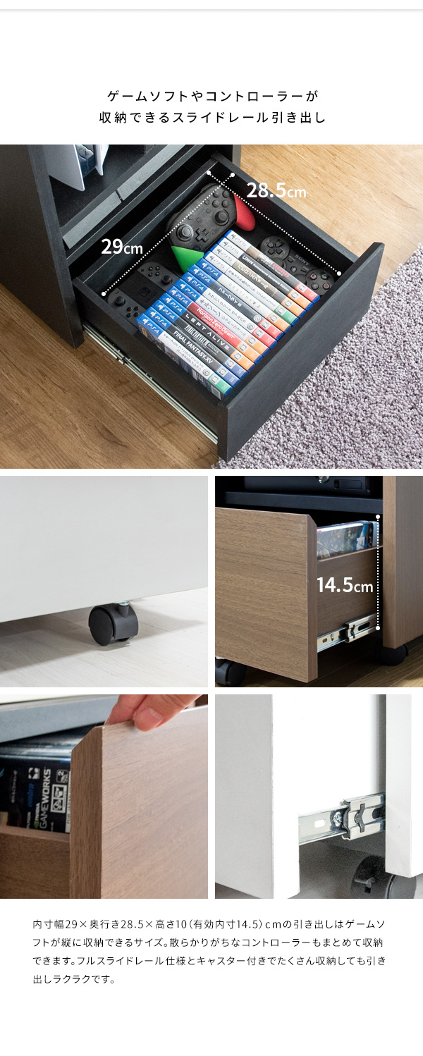 プレステ5が楽々収納できる事はもちろんの事、下部収納スペースにはPS4等のゲーム機、引出にはゲーム機周辺機器やゲームソフトが収納(ソフト最大20枚収納可能)できます。