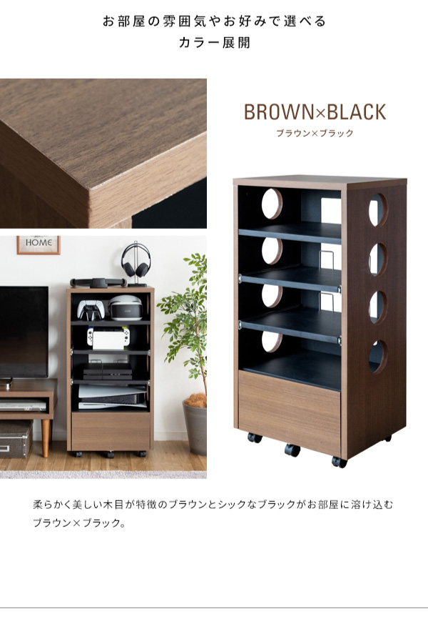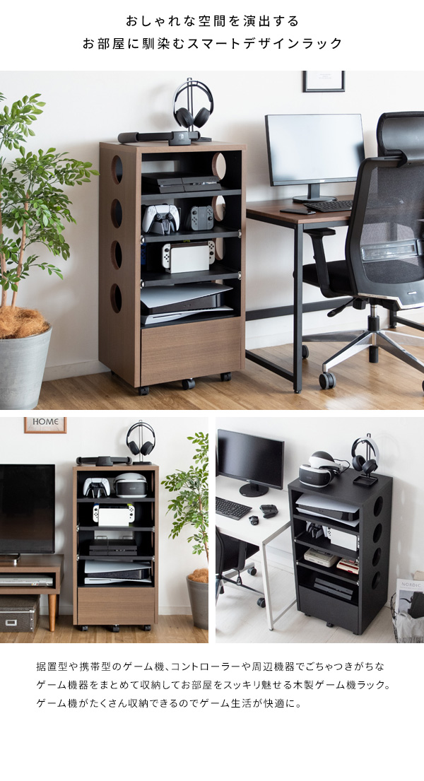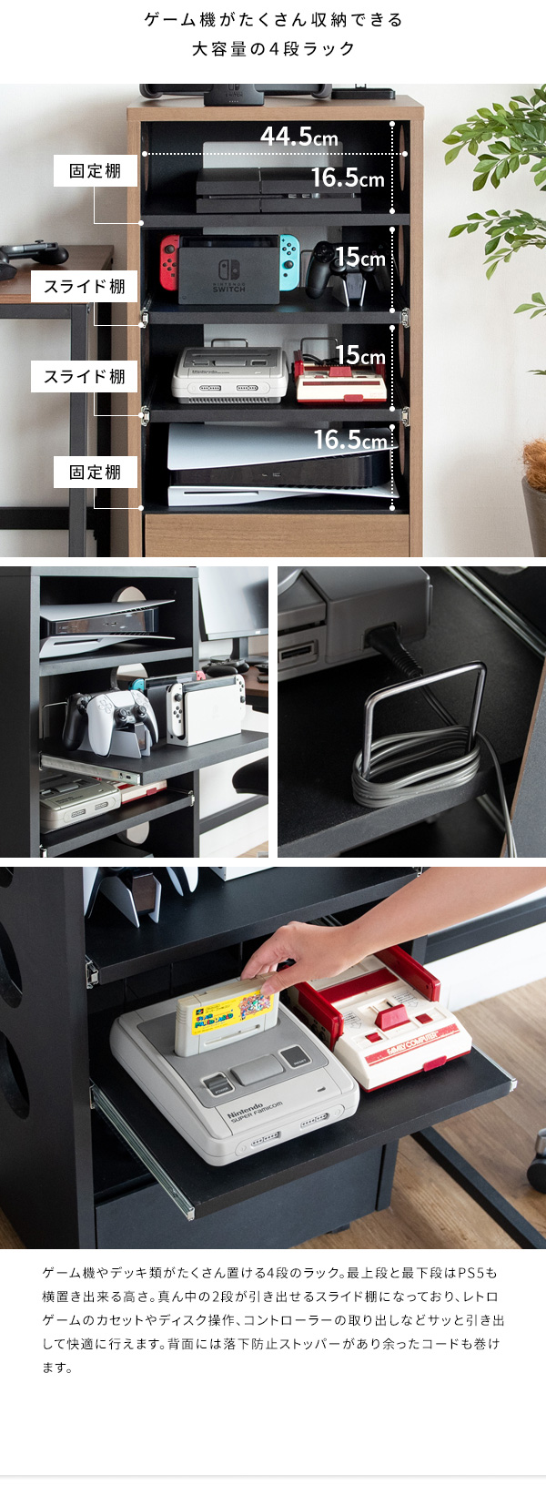 ゲーム機が最大4箇所に収納でき、内2か所はスライド棚なので使用勝手もいいです。