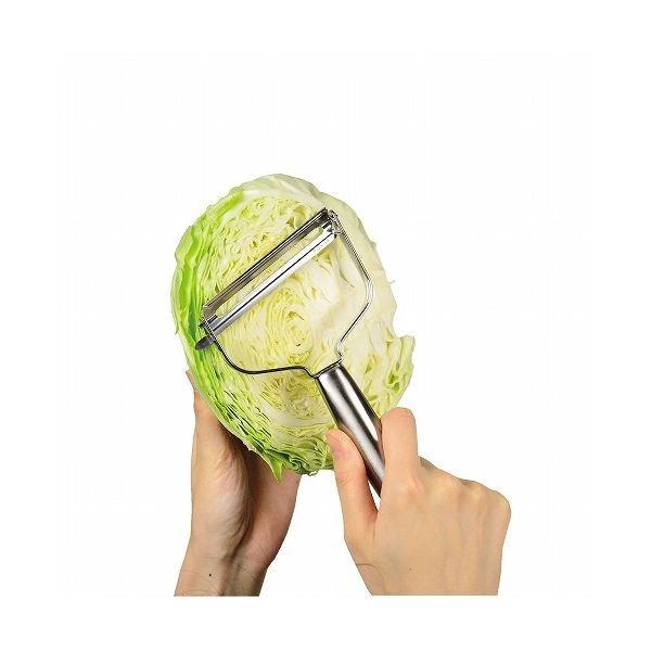 包丁いらず。ギザ刃がキャベツに食い込み、なぞるだけでザクザク極細千切りができます 握りやすく、軽くて使いやすい丸みのある一体型中空ハンドル ワイドサイズなのでキャベツだけでなく、玉ねぎのスライスやピーマンの輪切りも可 ジャガイモの芽取り機能付 食器洗い乾燥機使用可 ものづくりのまち、新潟県燕三条産