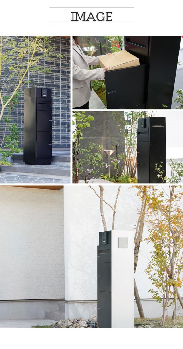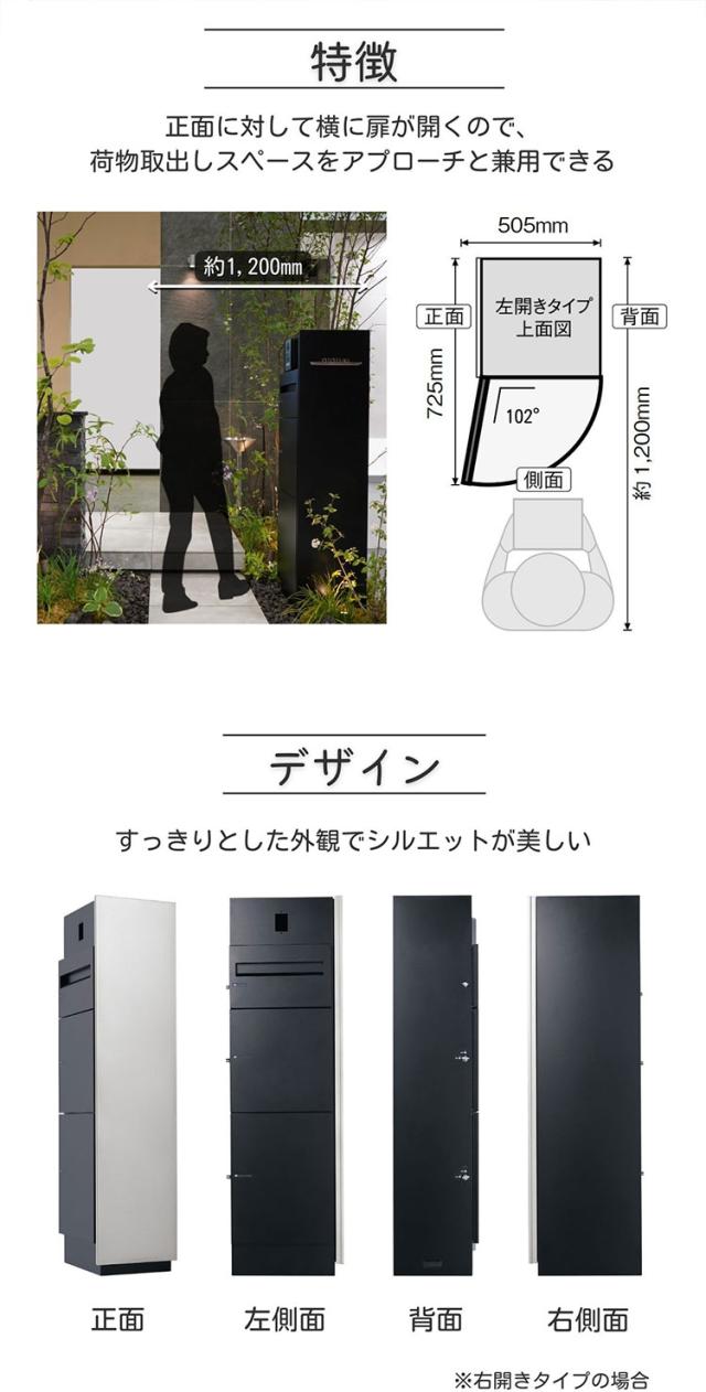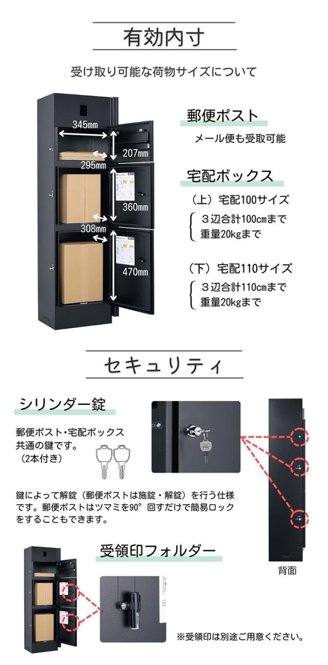 郵便ポスト(有効内寸:幅345×高さ207×奥行295mm/メール便受取可)、宅配ボックス100(有効内寸:幅345×高さ360×奥行308mm/3辺の合計が100cm・重量は20.0kgまで)、宅配ボックス110(有効内寸:幅345×高さ470×奥行308mm/3辺の合計が110cm・重量は20.0kgまで)が含まれる門柱ユニット。