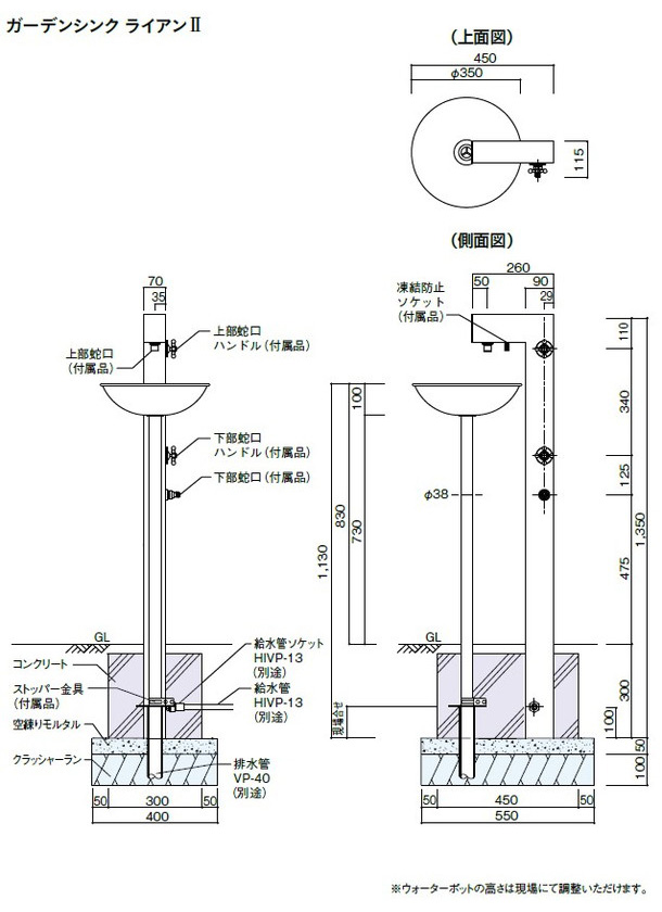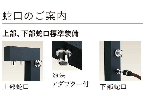 上部、下部蛇口標準装備。※蛇口は単品販売していません。