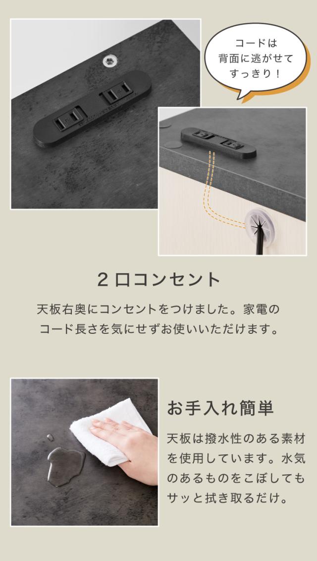 幅79.6×奥行44.5cm(約)の広々とした天板。耐荷重約30kgなので、調理家電なども設置可能。天板右奥に2口コンセント、背面側に配線孔が付いています。