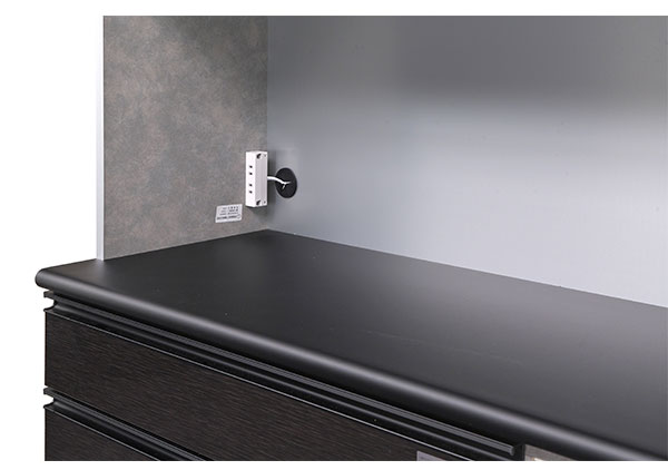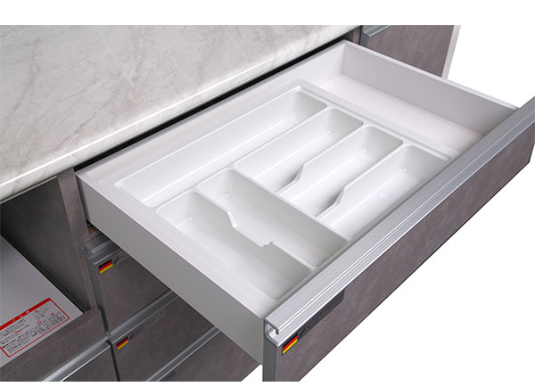 引出全段(5杯)ソフトクローズ機能付き(ヘティヒ社製クアドロレールを使用)、家電収納スペースの上部はモイス材を設置しております