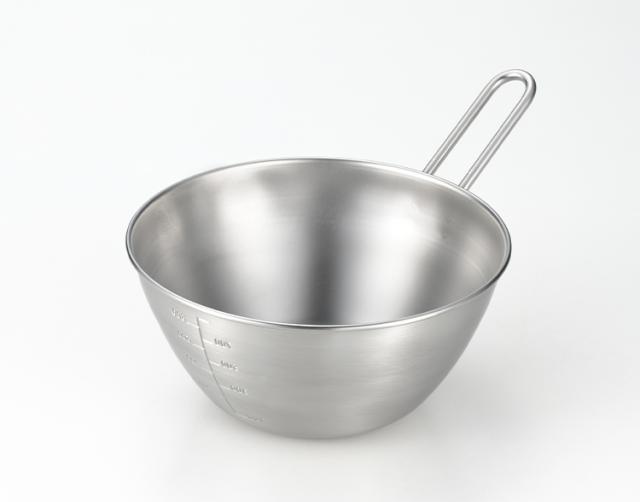 約16cmの手付きボウル。混ぜたり、こねたりする作業もしやすい深めタイプ。取っ手付きなので安定して混ぜたりといった動作がスムーズにこなせます。