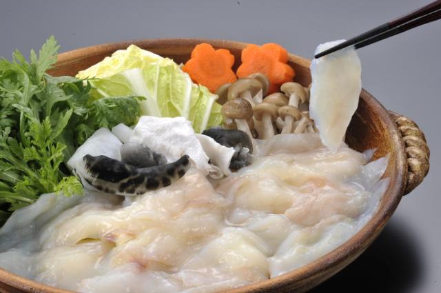 生で食べてもおいしいふぐの「皮」と「身」を趣向をこらして「しゃぶしゃぶ」用に、少し厚めに切りました。ふくのだしで造ったスープにさっとくぐらせるだけでふくの美味しさがいっそう増します。