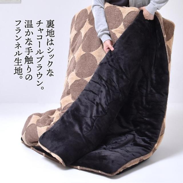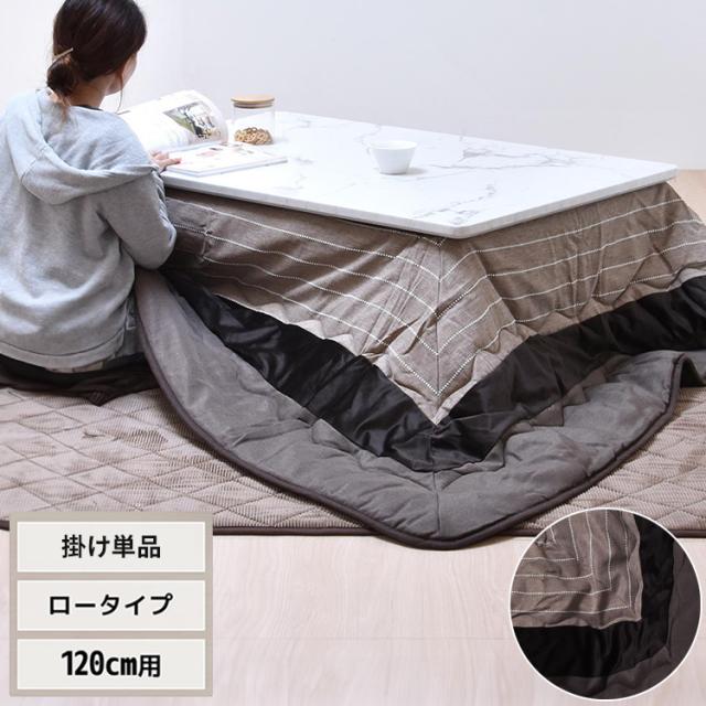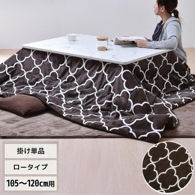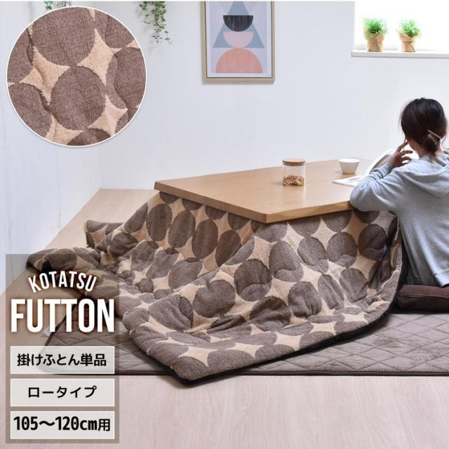 ローコタツ専用の掛布団です。適度な厚みの掛布団なので、薄すぎて寒いという事もなく、厚すぎてごわつくという事もなく、使いやすいのではないかと思います。生地の色合いは落ち着いていた色目ですが、アクセントのある柄でセンスの感じる雰囲気になっています。対応サイズは【幅105〜120×奥行75〜80cmのロータイプコタツ】に対応した掛布団になります。