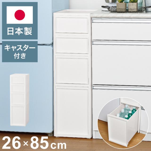 隙間収納 ミドルストッカー 幅26cm リセスタイル 日本製 引出し4段 S2段/M1段/L1段 キャスター付き JEJアステージ すき間収納 収納ボックス 収納ケース 白 ホワイト(代引不可)【送料無料】