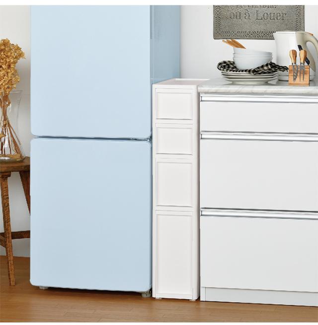 ・オールホワイトの隙間収納チェスト。中身が透けないのでスッキリして見えます。