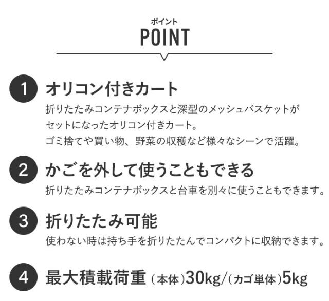 最大積載重量 本体:30kg(カゴの重さを含む)、カゴ単体:5kg
