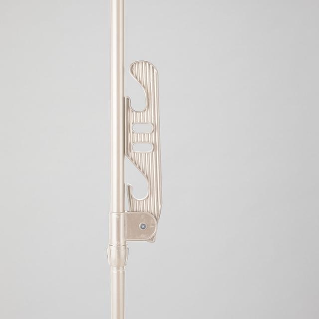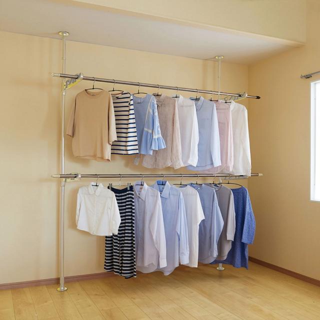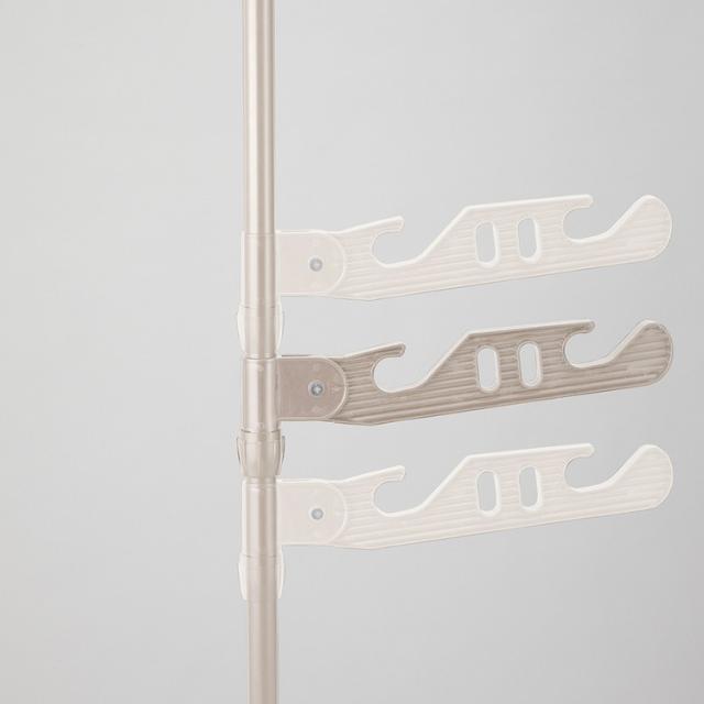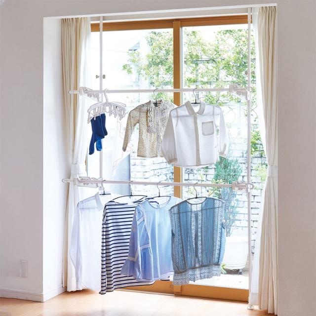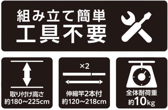 ライトグレーカラー物干しシリーズ不使用時はカーテン裏にコンパクトに収納できます。内蔵バネ+ジャッキ方式でしっかりと固定できます。専用伸縮竿2本付 約120〜218cm(竿は本体に掛けられます。)。取り付け高さ180〜225cm。竿受けの高さは約7〜156cmまで調整出来ます。組み立て時工具不要。