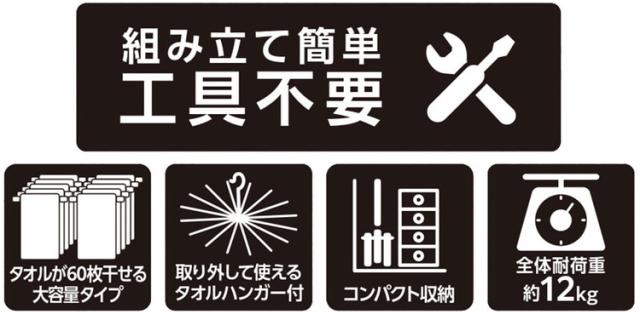 ライトグレーカラー物干しシリーズタオル掛け部は上段20本・中段20本・下段20本とたくさん干せる大容量仕様。脚部は一度に折りたたみ可能だから簡単に収納出来て、安定性も抜群です。上部のタオルハンガーは取り外して使用できます。支柱はサビに強いステンレス巻きスチールパイプ。組み立て時工具不要。