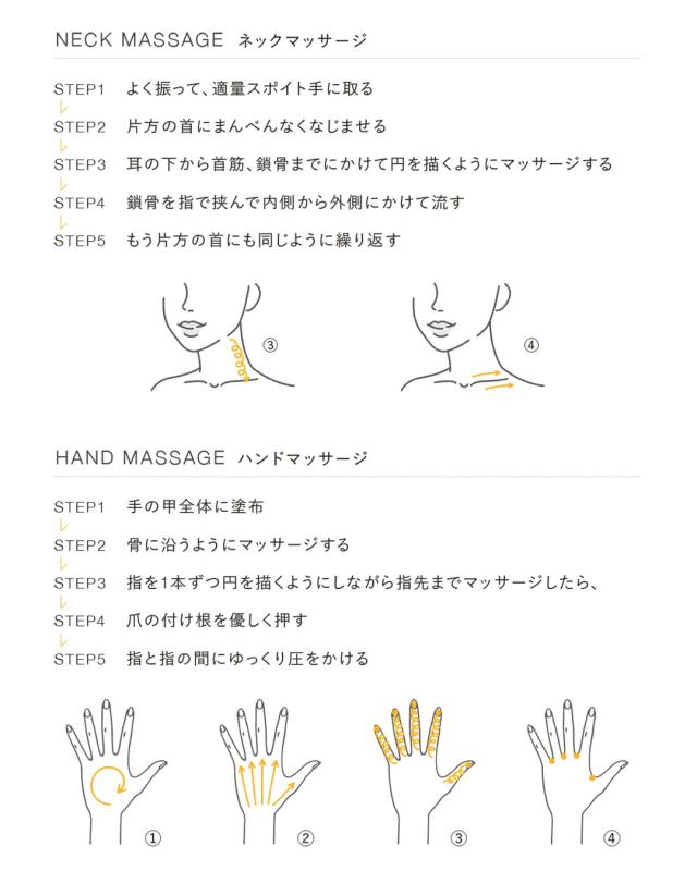 HOW TO USE — 効果的な使い方 — よく振ってから適量をスポイトにとり、気になる首元や手肌になじませてマッサージしてください。よりしっとりとさせたい場合、仕上げにコンセントレートクリームの重ねつけがおすすめです。