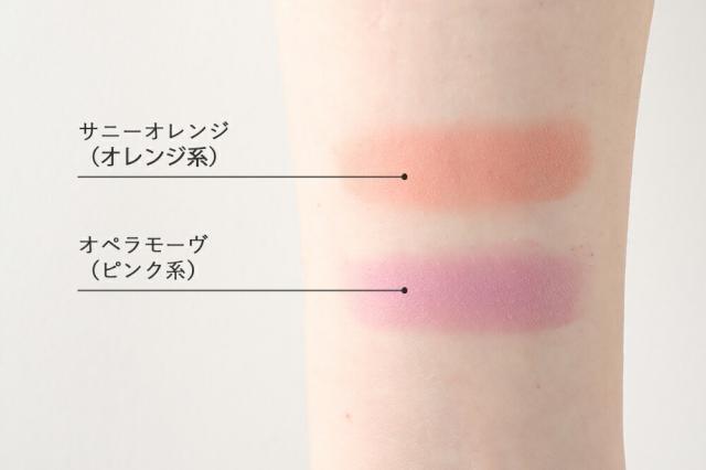 あいらしい青みピンク系の「オペラモーヴ」と、フレッシュなオレンジ系の「サニーオレンジ」のコンビネーションで、2色合わせれば自然なサーモンピンクの肌色に仕上がります。