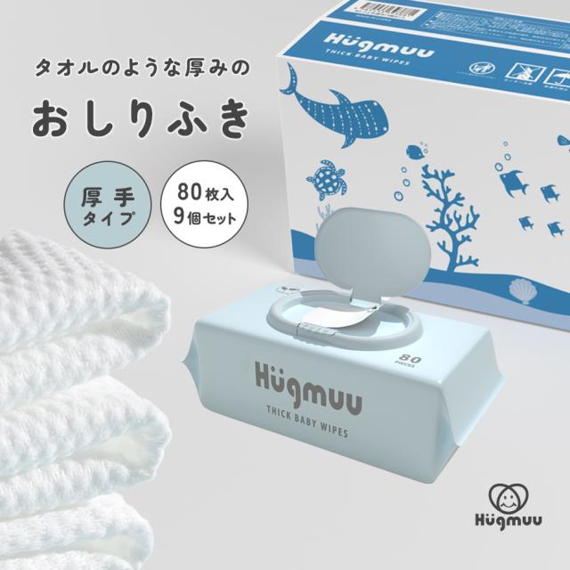 おしりふき 厚手 タオルのような厚み 大判 蓋付き 80枚入り×9個 ウェットティッシュ おてふき 体拭き おしり拭き お尻拭き お尻ふき Hugmuu ハグムー