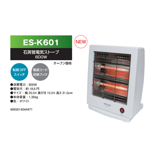 在庫あり 石英管電気ストーブTEKNOS テクノス 600W ES-K601 ホワイト 電気ヒーター シンプル 薄型 足元 小型