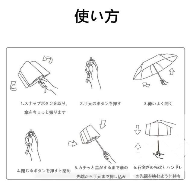 【頑丈な骨組み 自動開閉式日傘】丈夫で柔軟性のある10本骨でバランスよく傘を支え、超軽量折畳み傘でありながら、耐久性も向上され、風に強くて折れにくい。万が一強風に吹かれてひっくり返っても、折りたためば簡単に元戻り。さらに、手元のワンボタンを押すだけで自動開閉する日傘なので、車の乗り降りの時や、荷物で片手が塞がれている時は、簡単に傘を差す/閉じることができ、とても便利です。