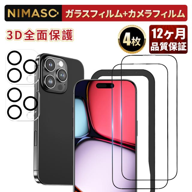 NIMASO ガラスフィルム (2枚) + カメラフィルム (2枚) iPhone 16 用 強化ガラス 黒縁あり iPhone16pro保護フィルム ガイド枠付き カメラ保護 レンズカバー 硬度9H 耐衝撃 自動吸着 指紋防止 アイフォン16promax
