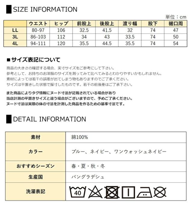 3L:ウエスト86-103 ヒップ112 前股上34 後股上43 渡り幅33.5 股下74 裾口周50