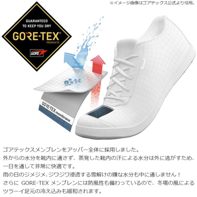 外からの水分を靴内に通さず、蒸発した靴内の水分は外に逃がす最高の機能性。