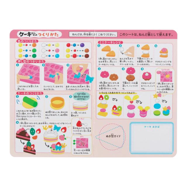 ねんど板付きで、机が汚れにくくお片付けも楽にできます。ねんど板のオモテ面には、色の作り方や道具の使い方、ケーキの作り方が分かりやすくまとめてあります。
