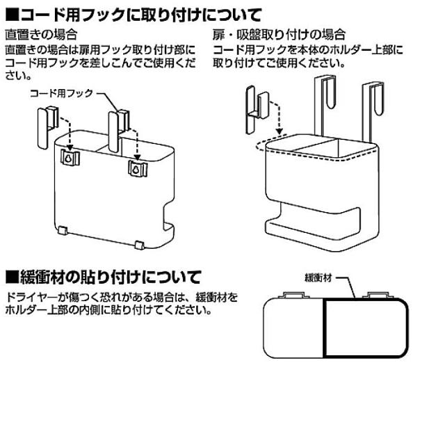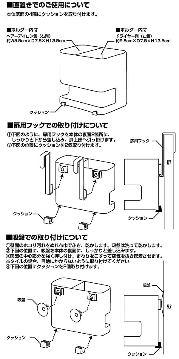| サイズ | 約 幅16×奥行8.5×高さ14(cm) 扉用フック使用時:約 幅16×奥行11.5×高さ22.5(cm) ホルダー内寸 ヘアーアイロン側(右側) 約 幅5.5×奥行7.5×高さ13.5(cm) ドライヤー側(左側):約 幅9.8×奥行7.5×高さ13.5(cm) |