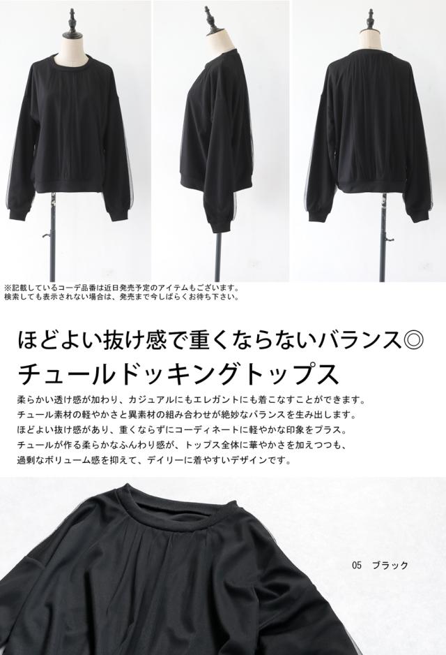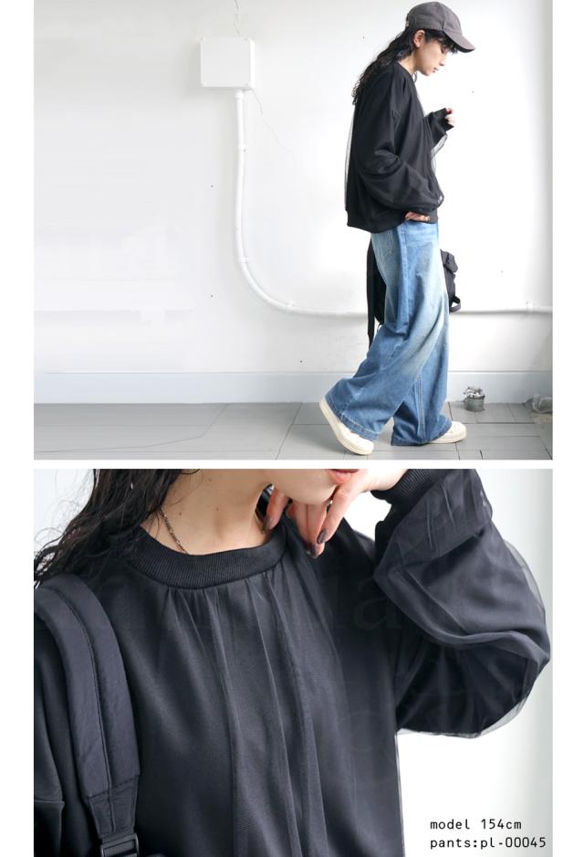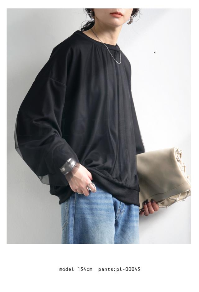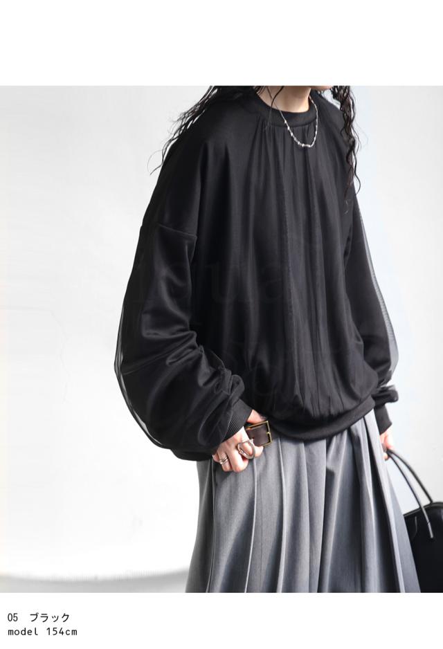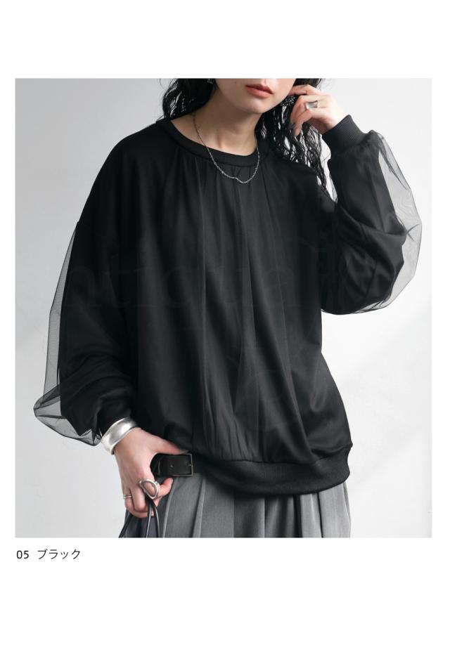 py-00785 チュール付トップス レディース トップス 長袖 丸首 クルーネック チュール シアー デザイントップス 無地 リブ プルオーバー 被り ショート丈 ゆったり きれいめ 着痩せ