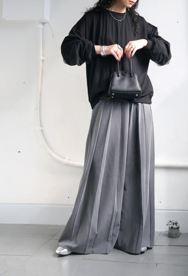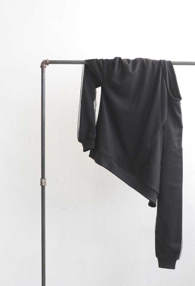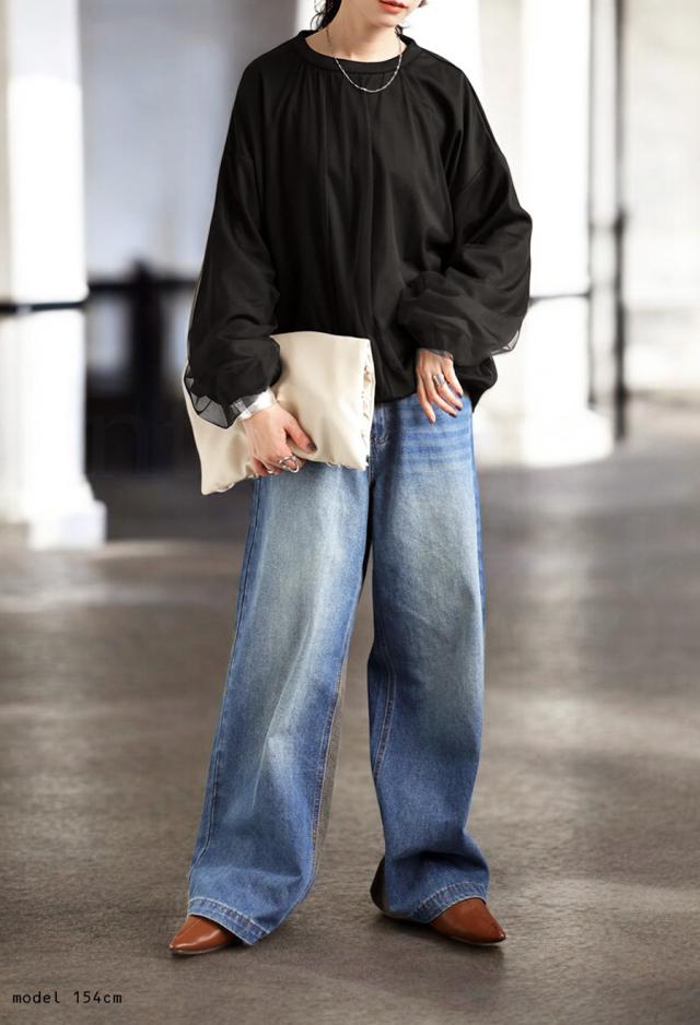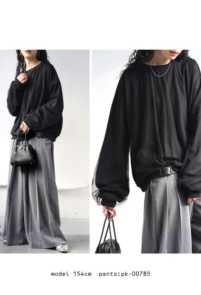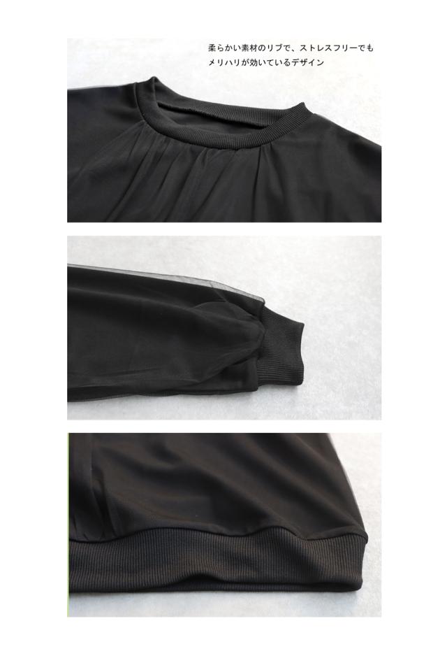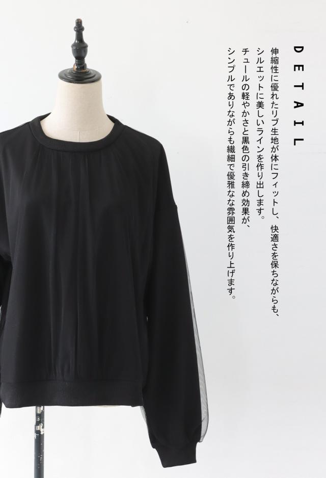 py-00785 チュール付トップス レディース トップス 長袖 丸首 クルーネック チュール シアー デザイントップス 無地 リブ プルオーバー 被り ショート丈 ゆったり きれいめ 着痩せ