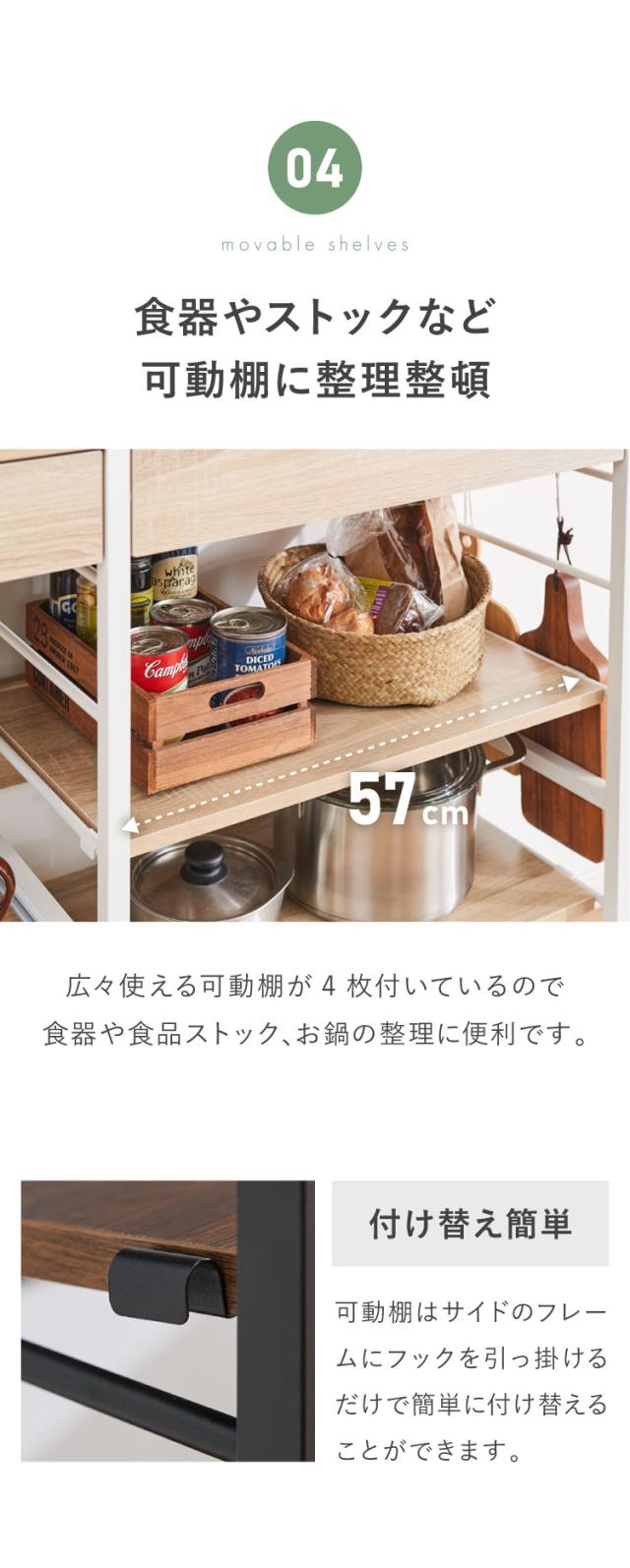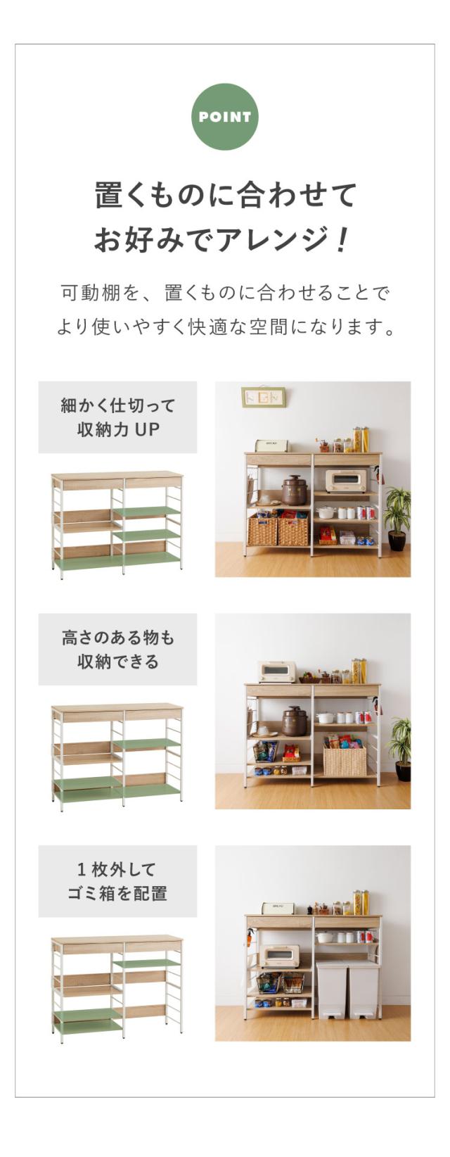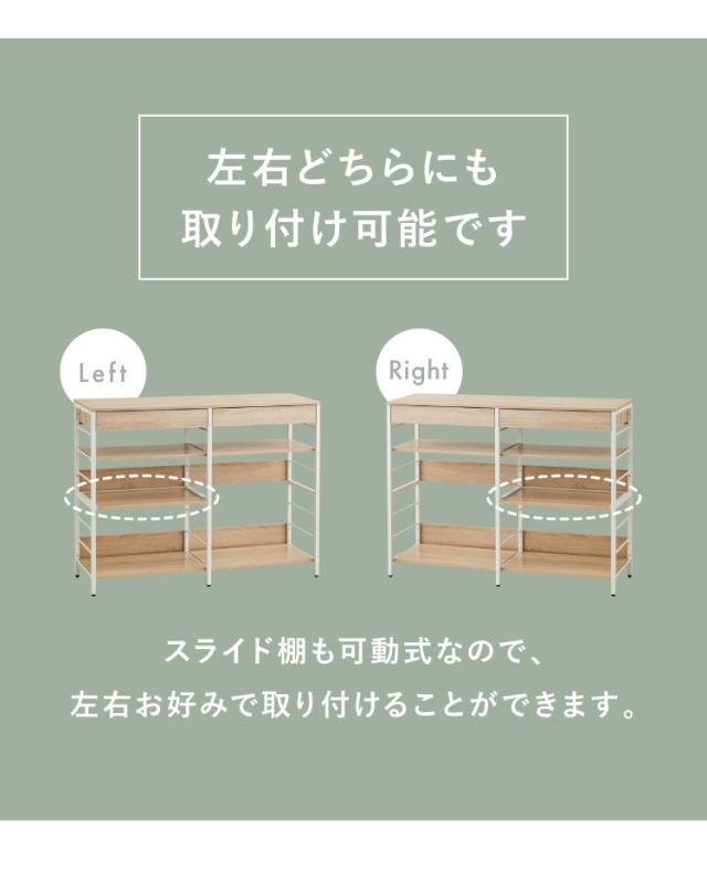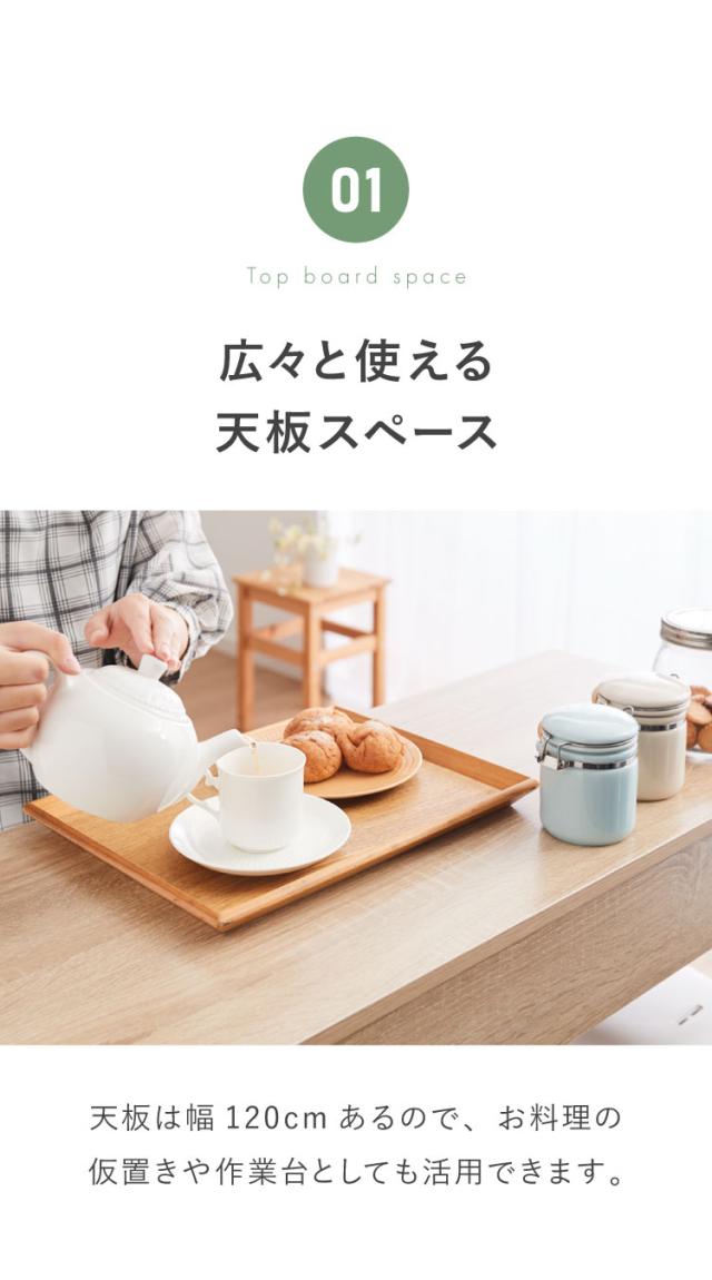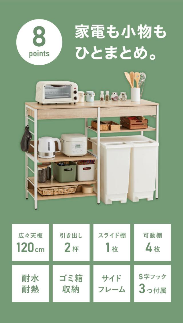 120cm幅の天板で調理スペースとしても快適にお使いいただけ、家事の効率をアップ。 ゴミ箱スペース横の収納は、全段に可動棚を採用。食器・調理器具・キッチン家電・食品ストックなど幅広い収納物に柔軟に対応いたします。