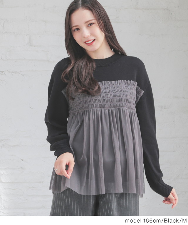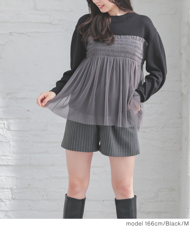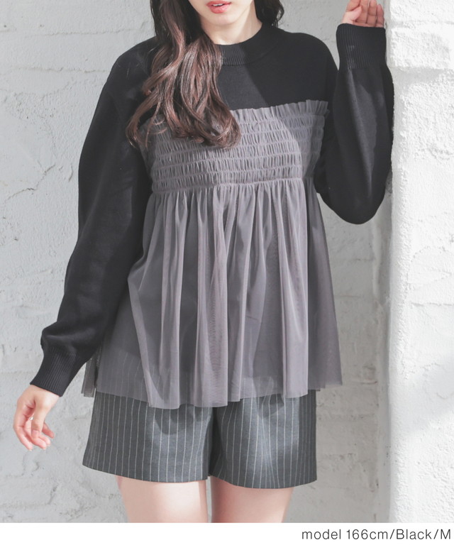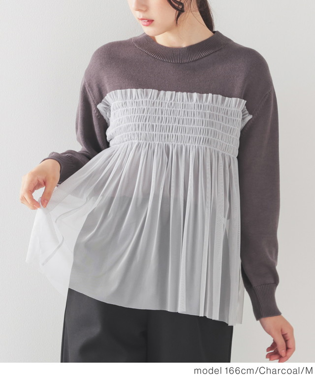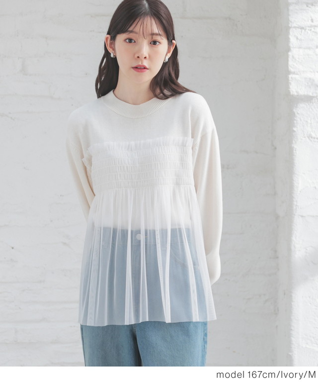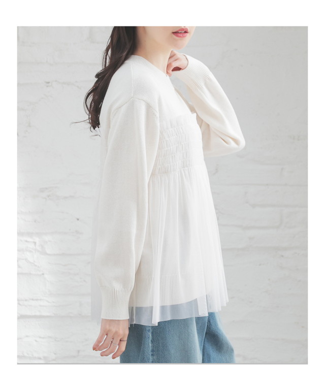 シンプルニットに同系色のチュールをビスチェ風にドッキングした、1枚で着映えするガーリーなデザイン。