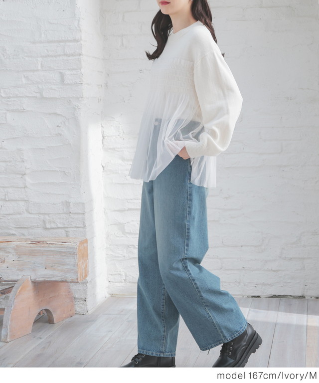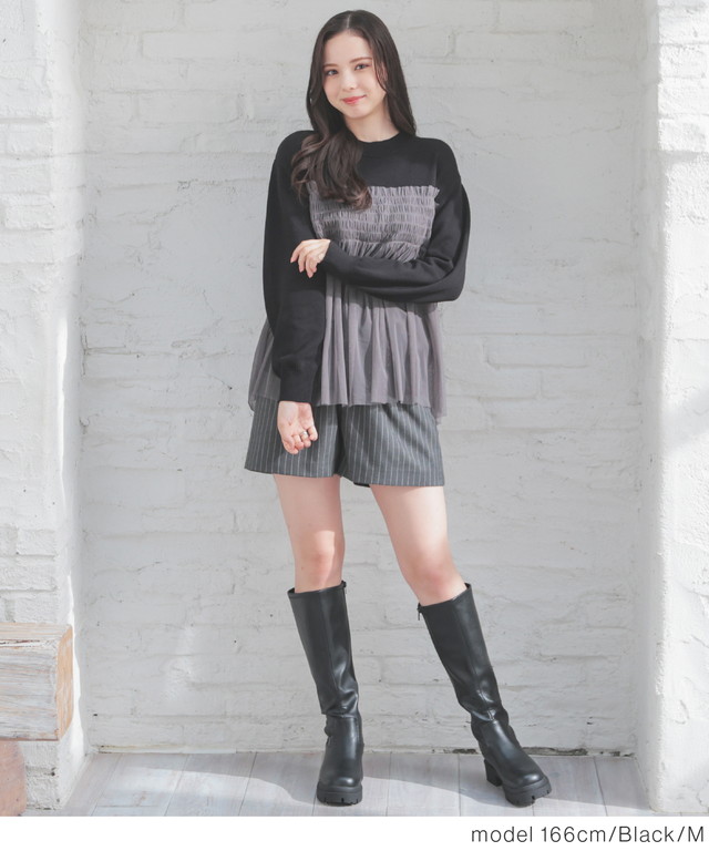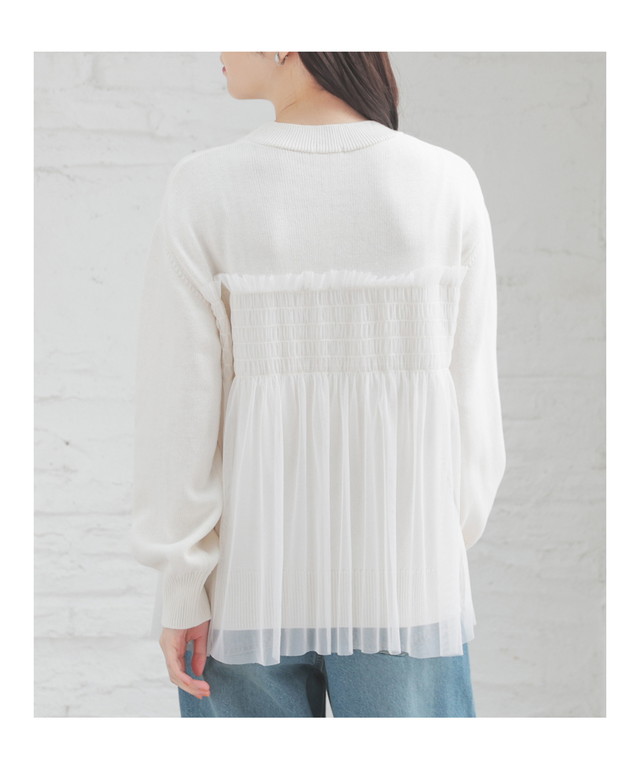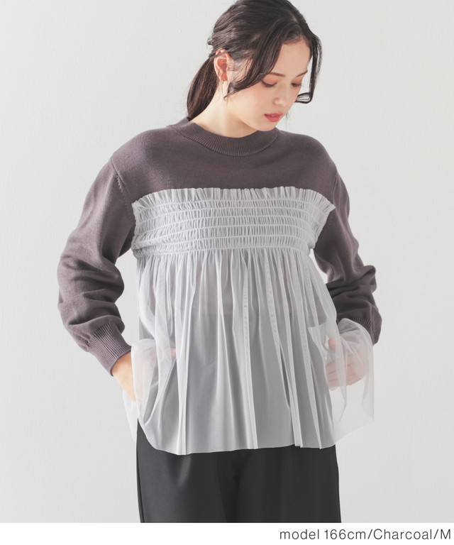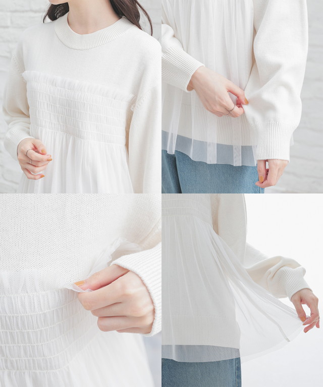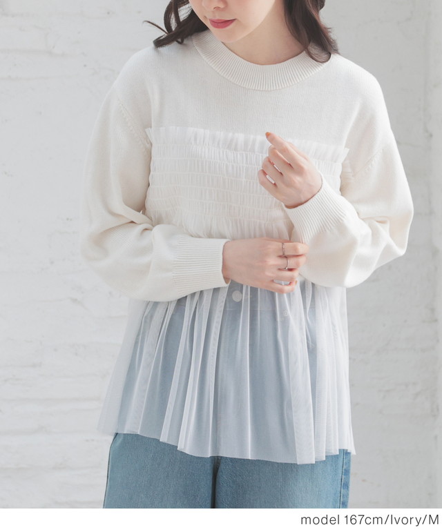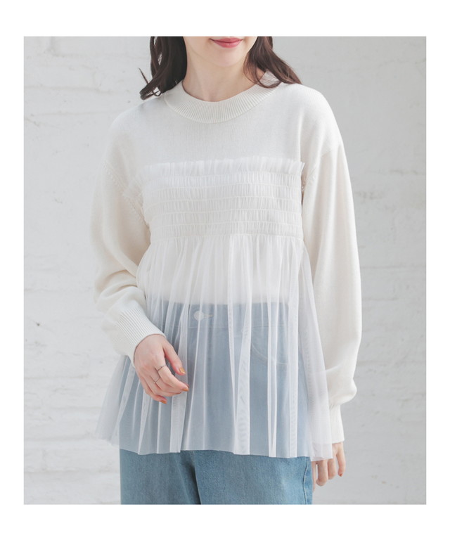 シンプルニットに同系色のチュールをビスチェ風にドッキングした、1枚で着映えするガーリーなデザイン。