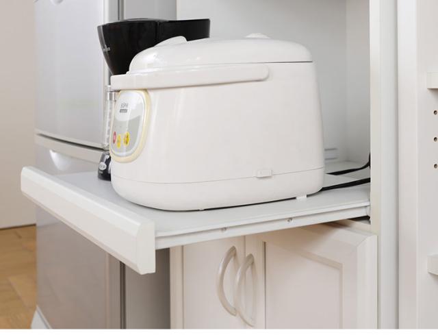 ・スチール製のスライドレール付き。炊飯器などの重たい家電を置いても軽く引き出せます