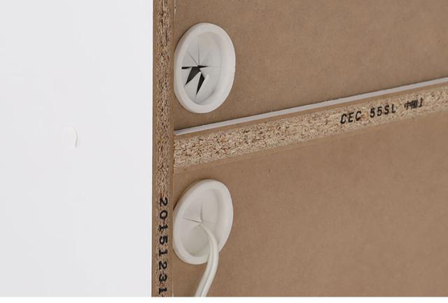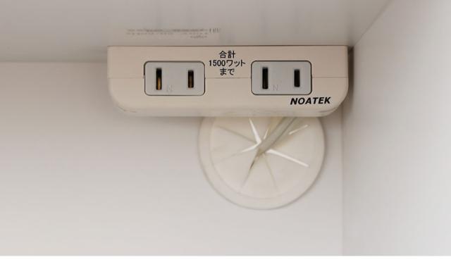 ・スライド棚のスペースには家電の設置に便利な2口コンセント。スライド棚とオープンの棚には配線穴がついています。