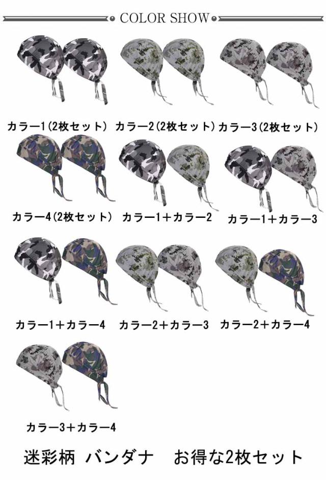 | 迷彩柄 バンダナ お得な2枚セット キャップ仕様だからさっと頭にかぶって後ろでキュッと結ぶだけのカンタン装着! 男女兼用で使える。ヘルメットの汗止めインナーキャップとしても。 お料理、キャンプ、調理、畑仕事、サイクリング、スポーツ、アウトドア、医療用キャップ帽子などで大活躍のバンダナキャップです。 | |