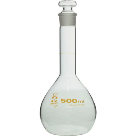 ●一定の体積を測るために用いられます。全量フラスコとも呼ばれます。●底の平らなフラスコに細長い首が伸びた形状で、首の部分に通常は1本の回線があります。●目盛のある首部分の径が細いため、同容量のメスシリンダーより目盛の精度が高いです。●一定の試薬濃度を正確に調整する時に使用されます。●目盛は受入体積(入っている体積)を表し、受用(入用)を意味するTCが表示しています。(TC:ToContainの略)・目盛は20℃の水を測定したときの体積を表します。●JIS規格(R3505)クラスBの「首太全量フラスコ」に準拠しています。