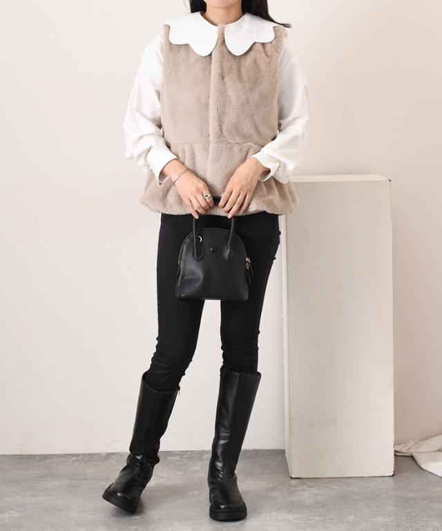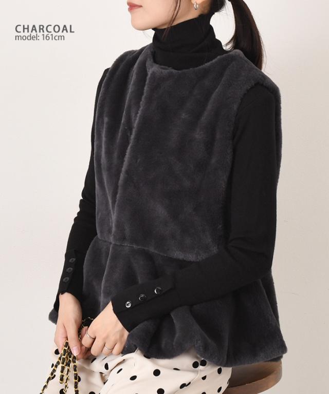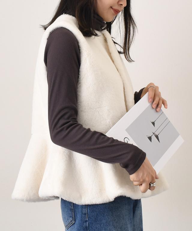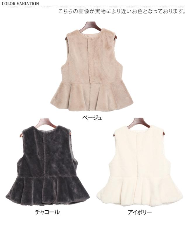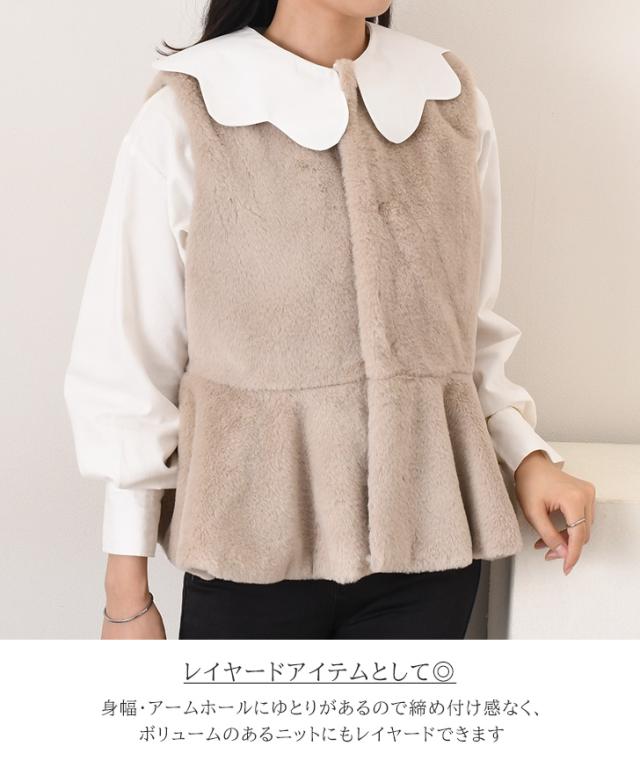 新作 ベスト レディース ペプラム アウター フェイクファー 前あき おしゃれ ジレ ノーカラー 軽量 軽い 羽織り 秋冬 防寒 きれいめ 暖かい