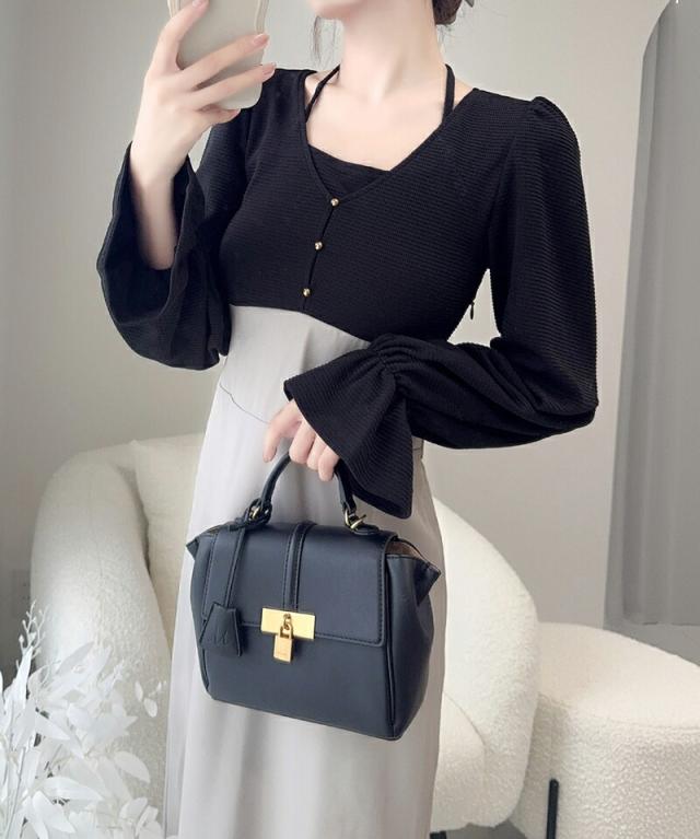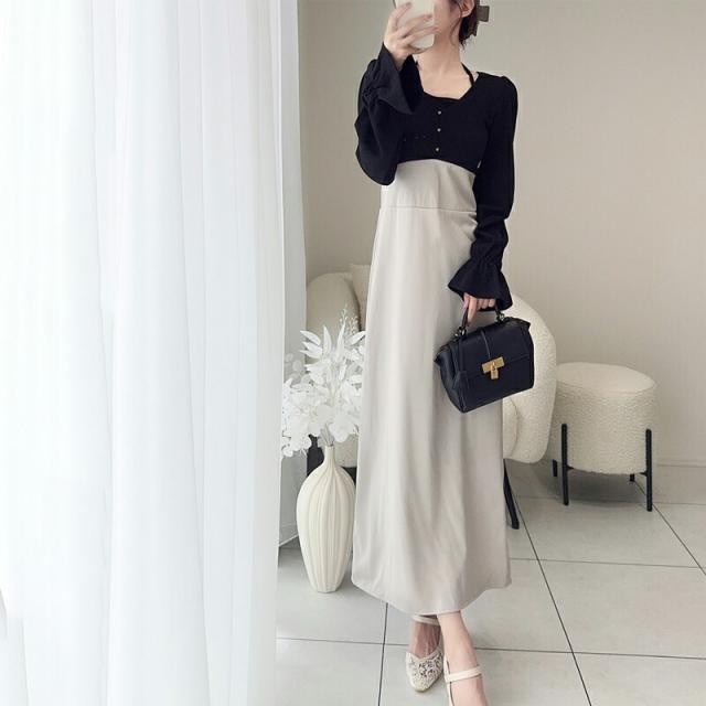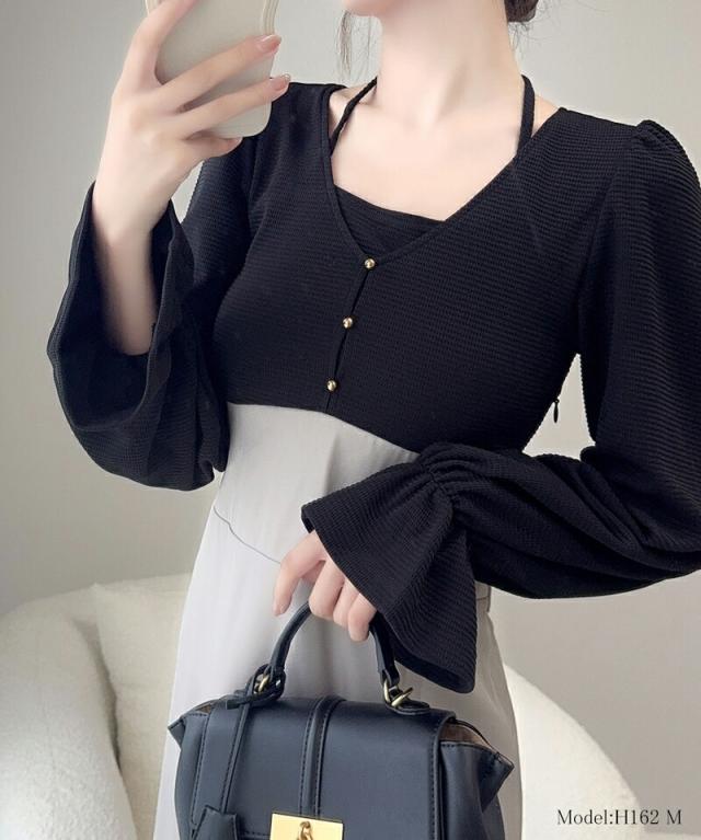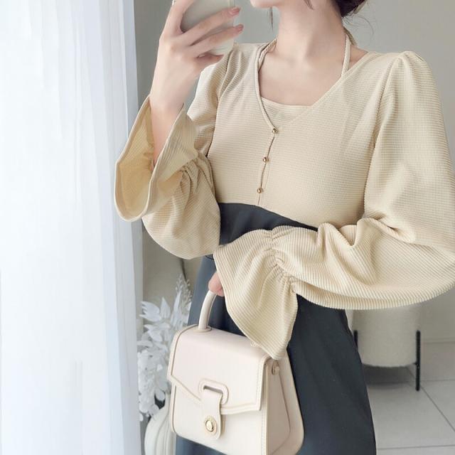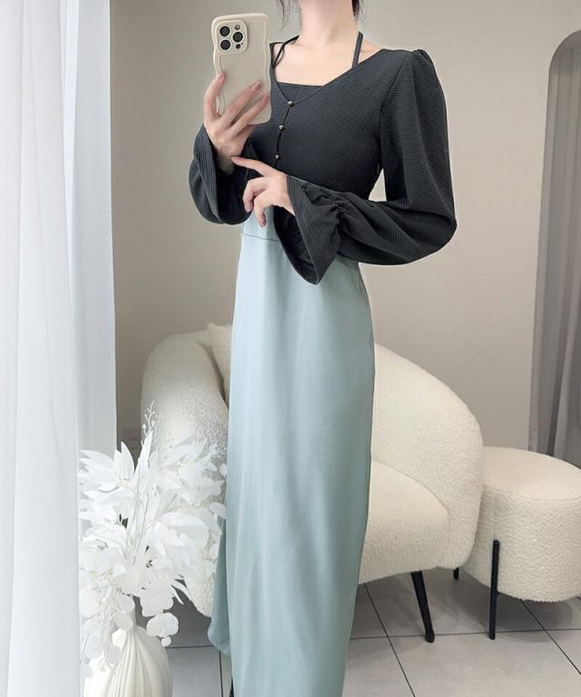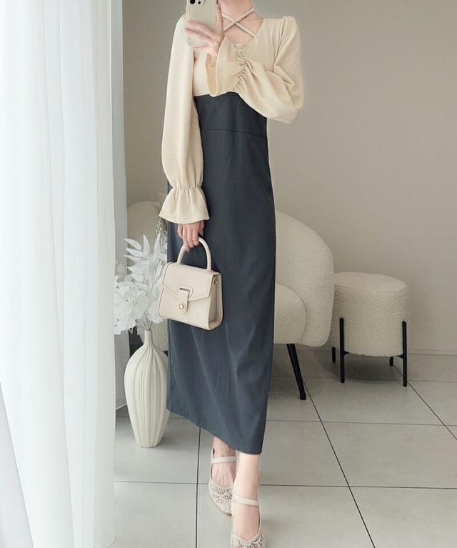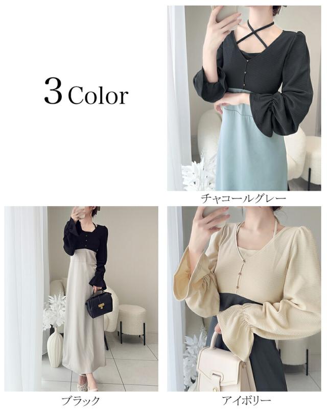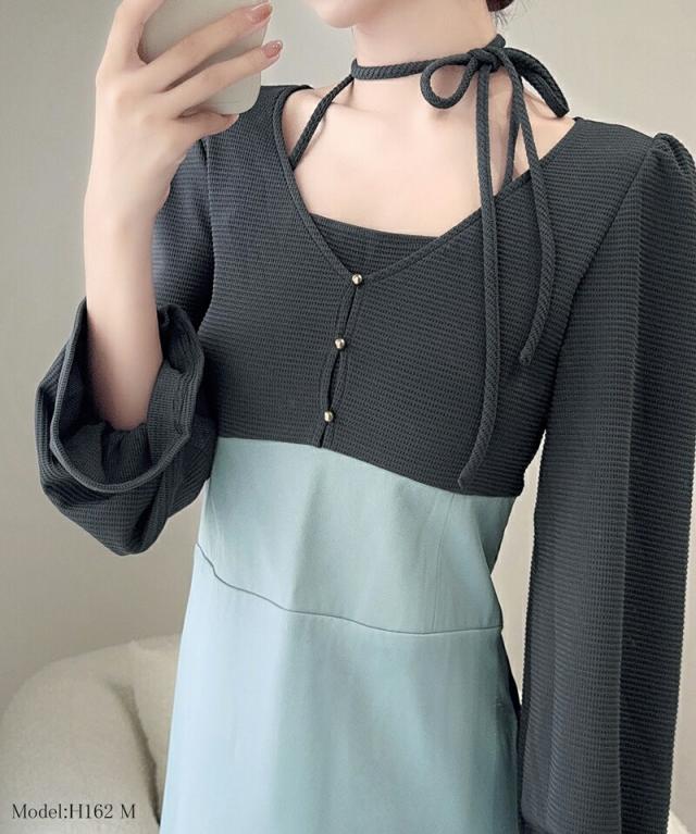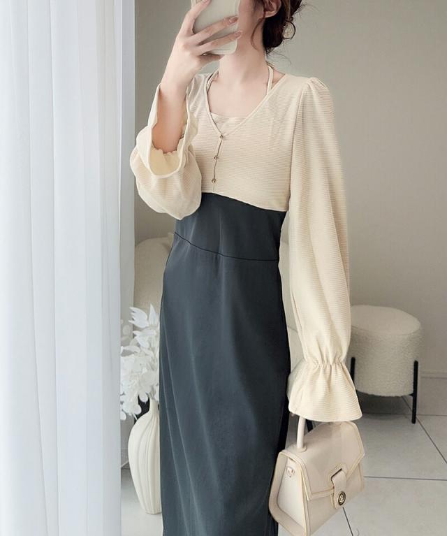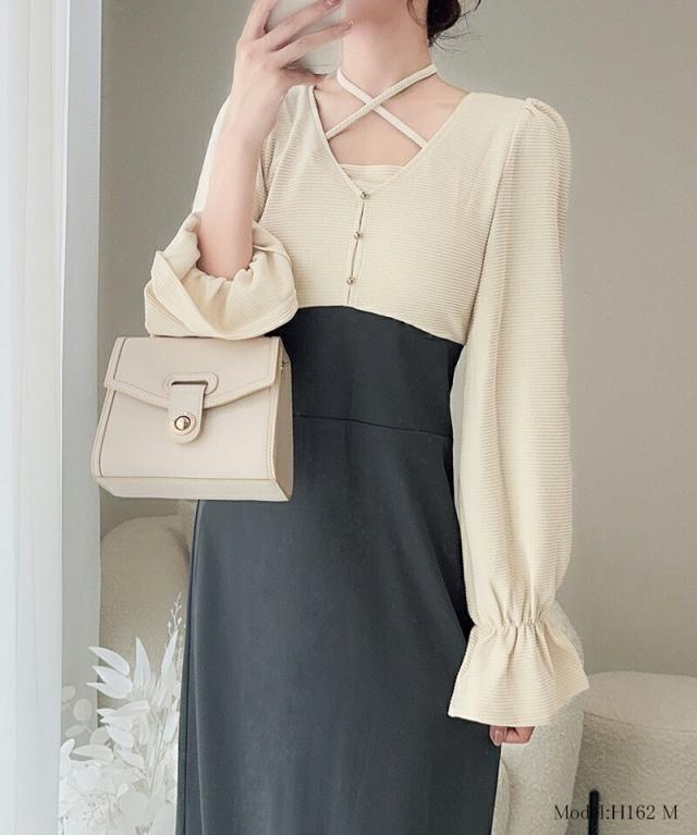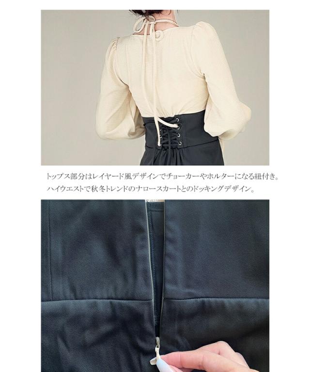 クラシカルエルフ春新作 mily bilet チョーカー デザイン レイヤード風 キャンディースリーブ ドッキング ナロー ワンピース レディース ハイウエスト 見え スタイルアップ レイヤードコーデ 大きいサイズ 2026ss mi1139052