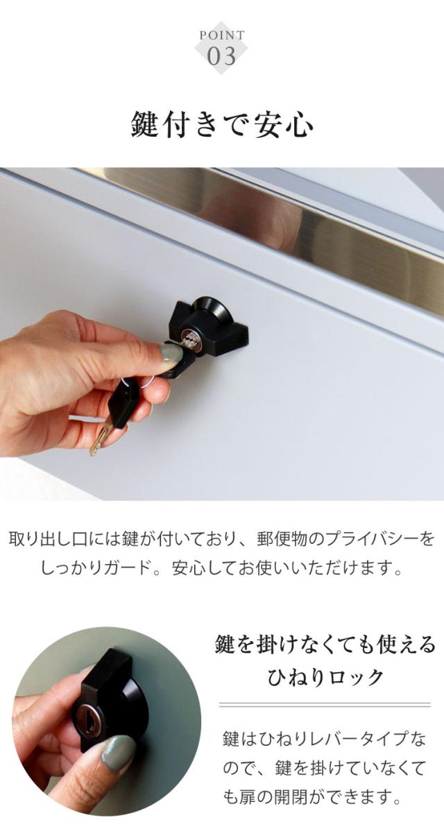 鍵部はひねりロックタイプを使用しており、ひねりレバーの操作で、鍵の開閉を行わずとも扉を閉めておくことが可能です。