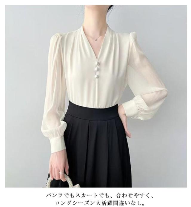 深Vネック シャツブラウス 長袖 長袖シャツ 20代 深Vネック パール 結婚式 レディース 入学式 卒業式 上品 オフィス 30代 40代 50代 通勤 フォーマル 大きいサイズ L XL 2XL 3XL